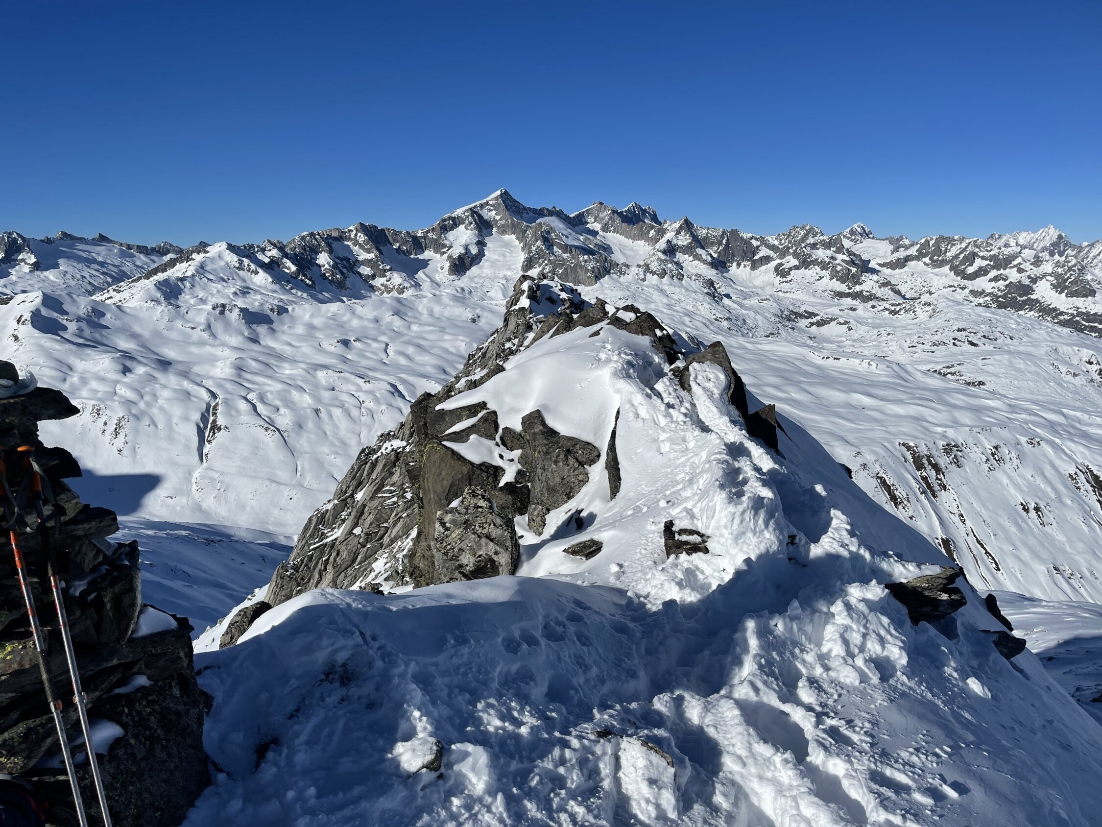 .. top Verhältnisse, nicht allzuviel Schnee im Gebiet, reicht aber für eine schöne Abfahrt ohne Steinkontakt bis Realp; lustiger Gipfel für alle, denen auf dem Rotälli zuviel los ist.