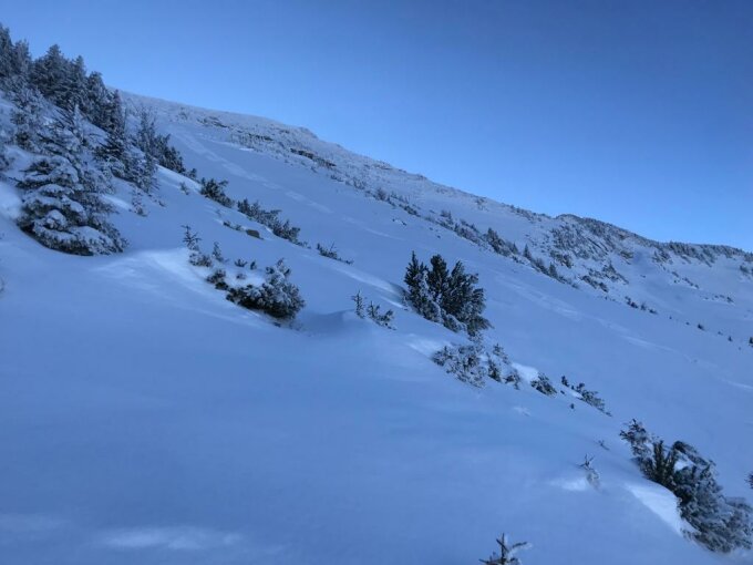 Top Bedingungen! Ganz oben eher wenig Schnee, aber noch knapp fahrbar, dann Pulverschneetraum bis runter ins Arvenbüel.