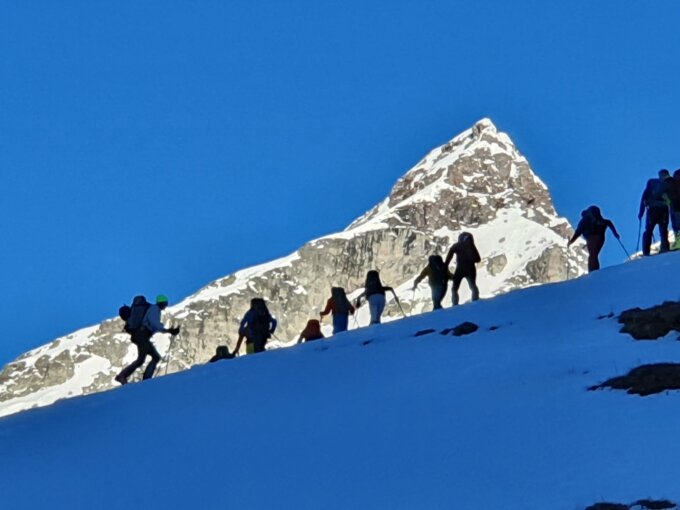 Gipfelbereich alpin, eisige Spur, Pickel und Steigeisen sehr vorteilhaft. Fixseil an der Felsstelle relativ kurz, evtl Reepschnurverlängerung mitnehmen.