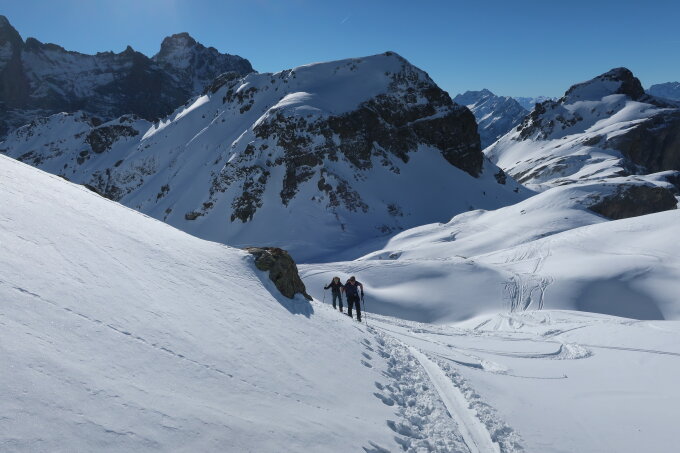 Darf wirklich als Top bezeichnet werden. Alles liegt im Schatten und daher sehr guter Pulver. Der Gipfelhang in der Sonne am Mittag aufgeweicht, problemlos. Im Aufstieg dort Harscheisen praktisch. Achtung dennoch in der Abfahrt auf versteckte Steine, nicht jede "Bodenwelle" ist auch nur eine Welle :-)