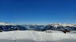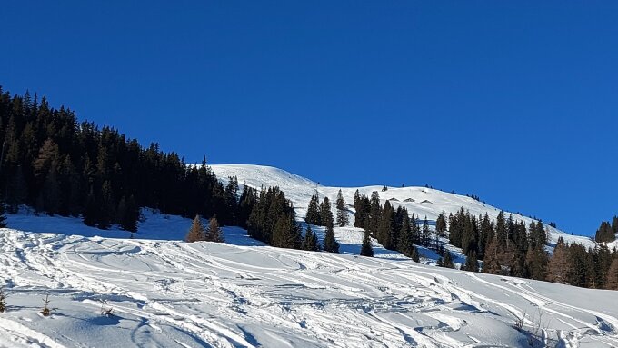 Die Hänge sind schon ziemlich zerfurcht. Richtung Hochwang noch viel unverspurtes Gelände.