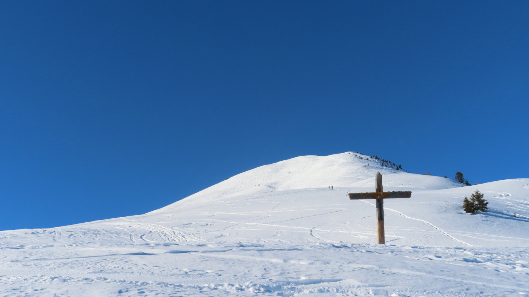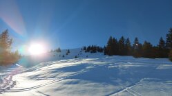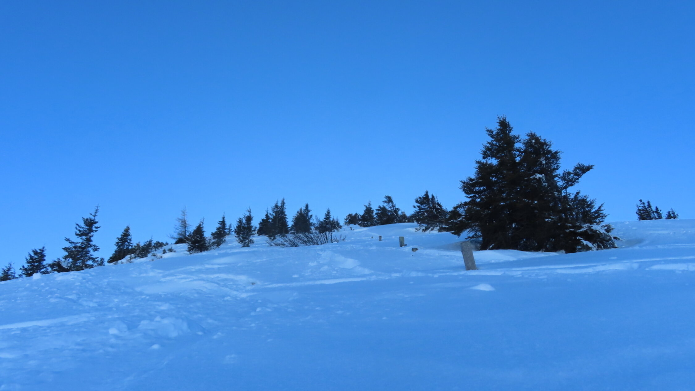 Den ganzen Tag strahlend blauer Himmel. Inversionslage. Nach -7 Grad im Tal in Hinterberg um den Gefrierpunkt. Nur am Gipfel zeitweise leichter Wind.