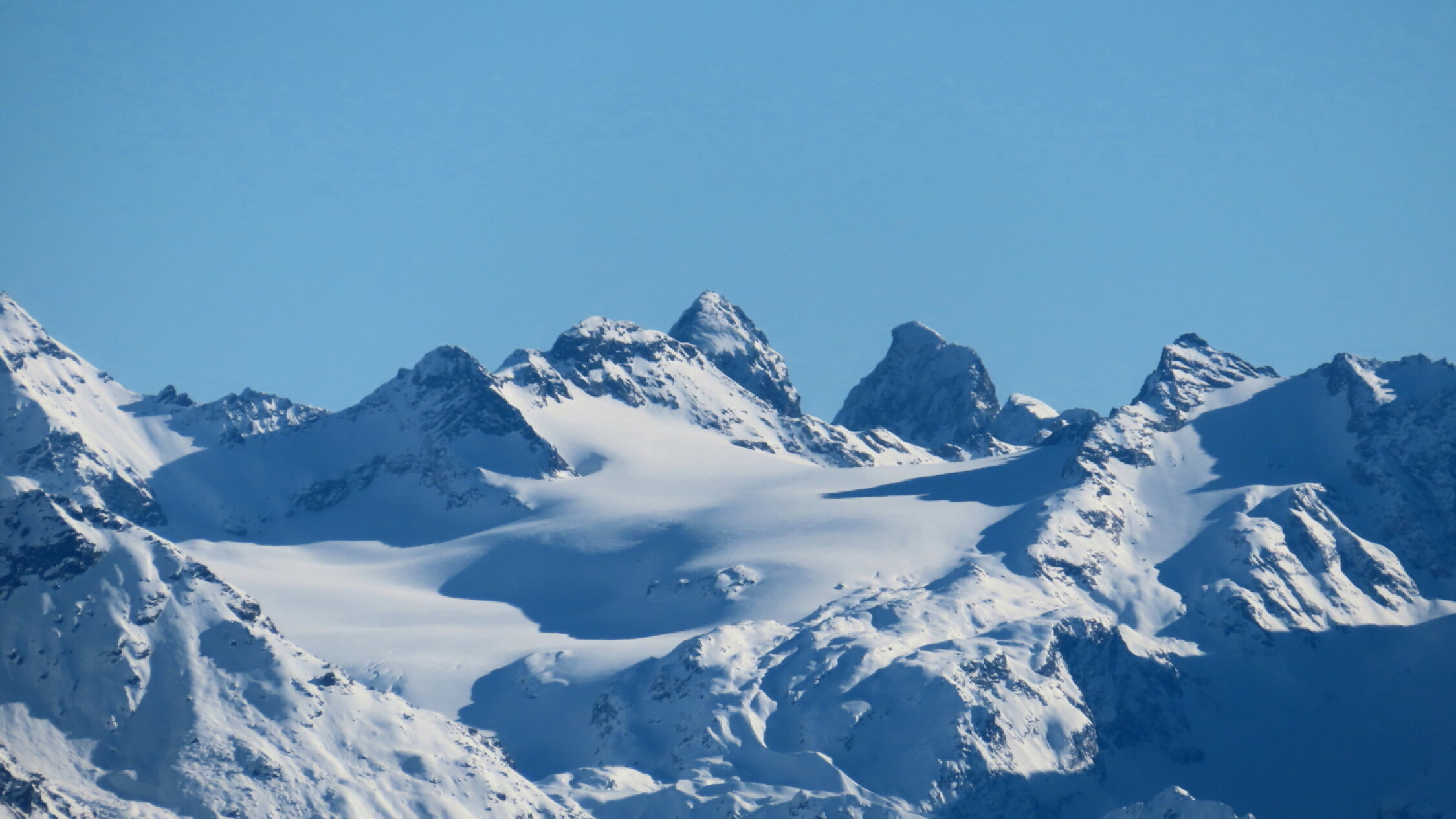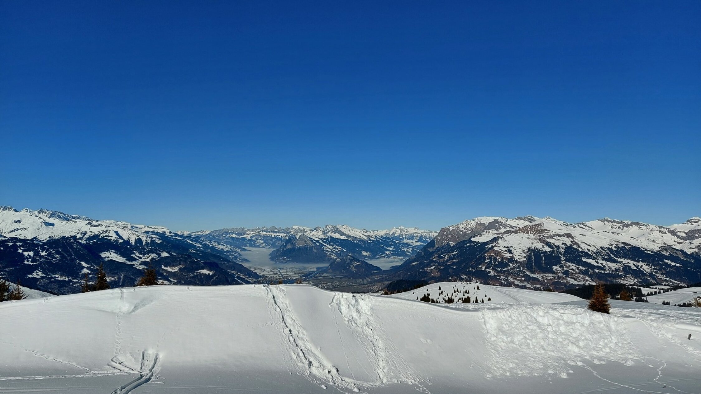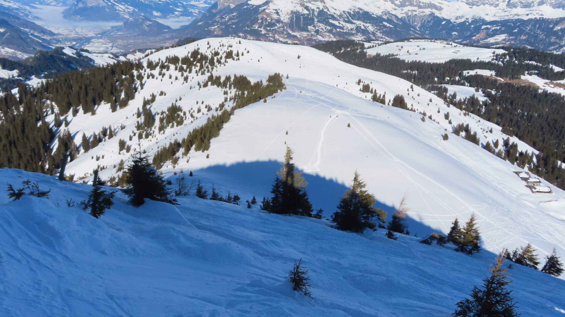 Die Schneelage in den nord- und ostexponierten Hängen ist im Allgemeinen gut. Pulverschnee. Beim Nordabstieg vom Fadeuer etwas Triebschnee mit Einsinktiefe bis zu den Oberschenkeln.