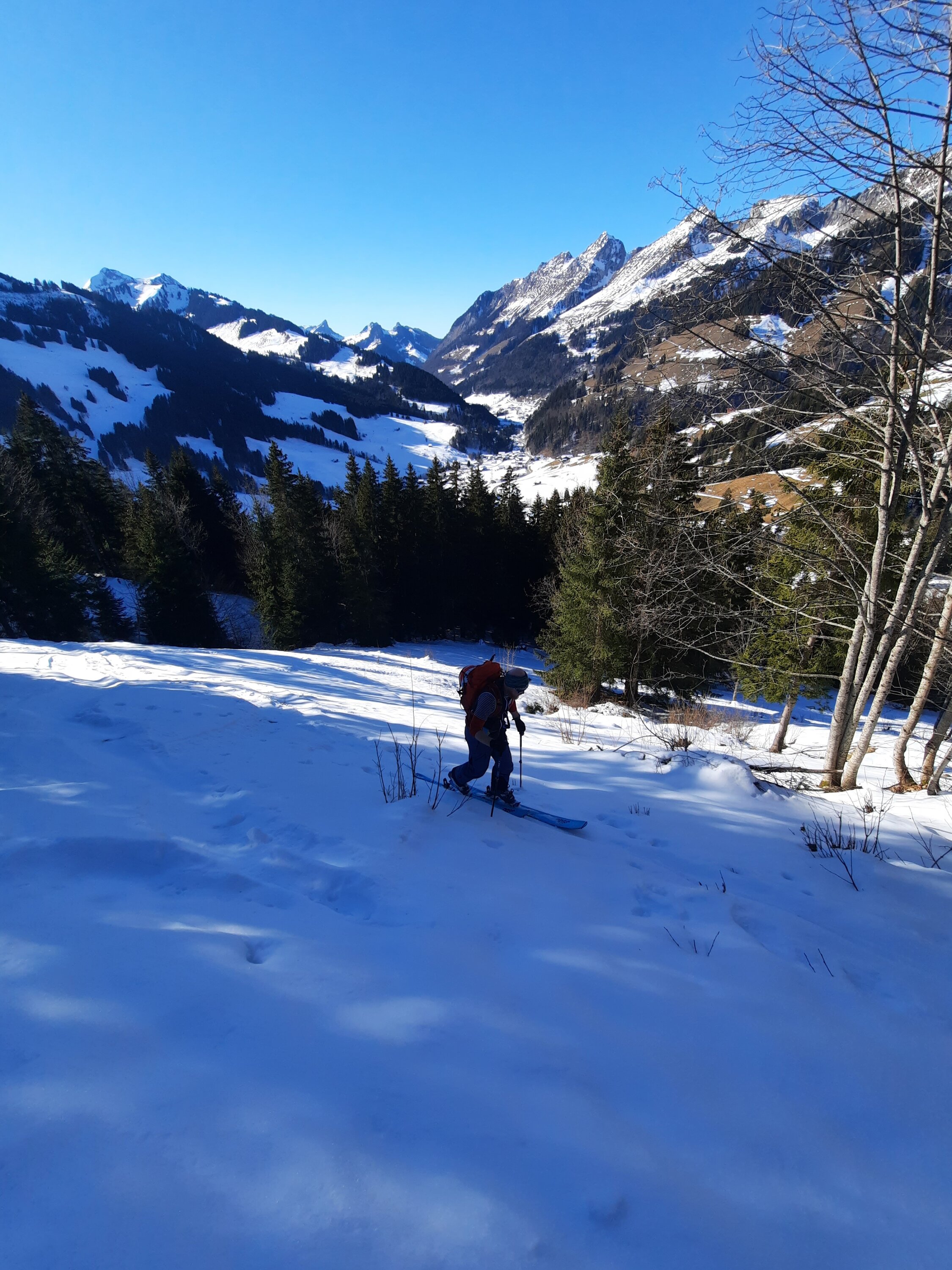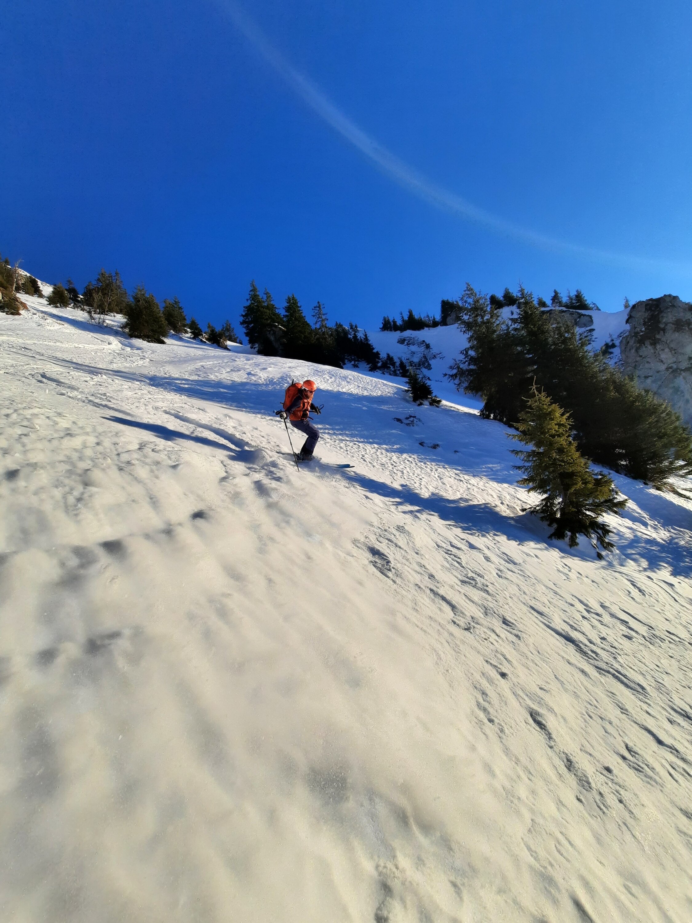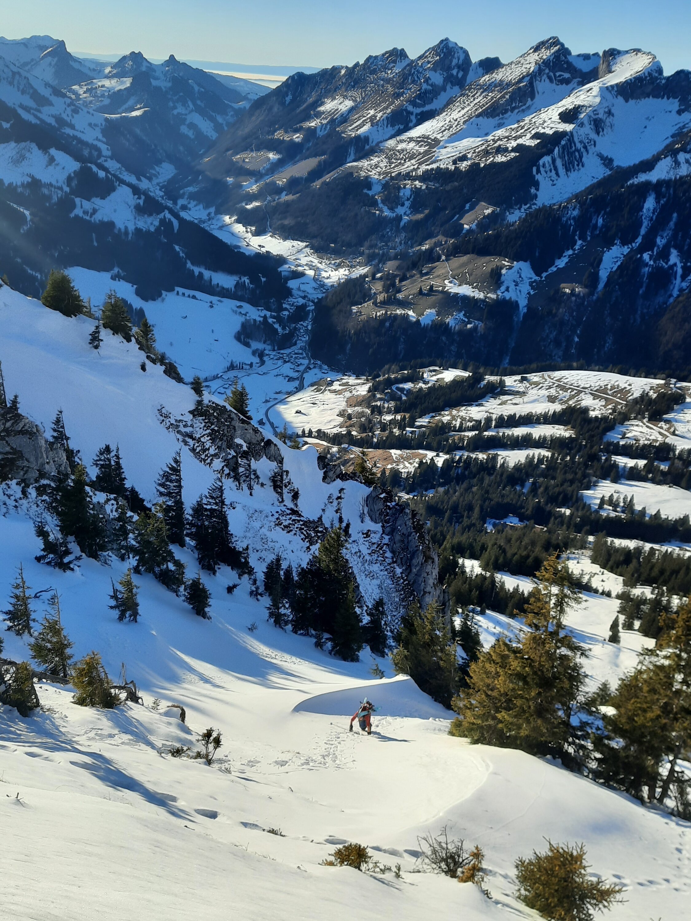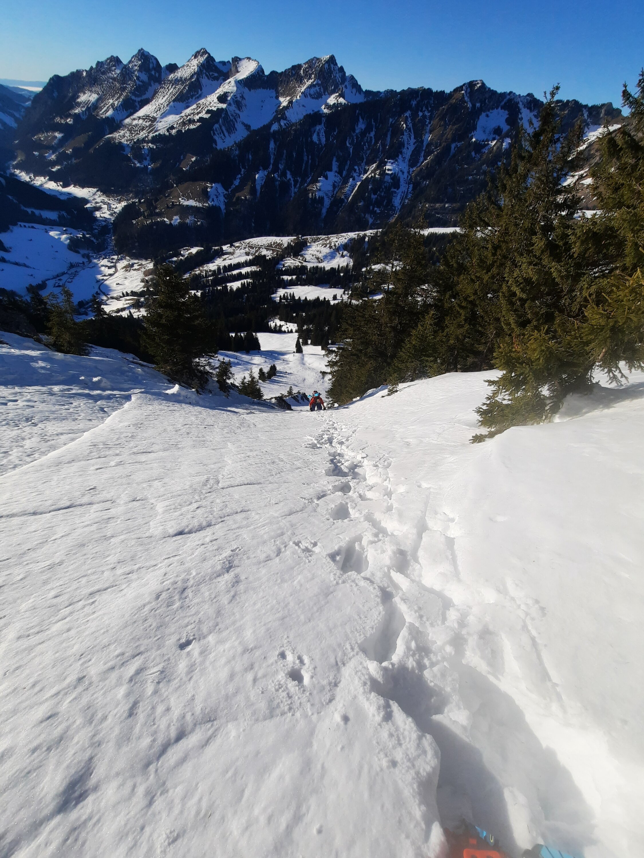 Start an Strasse direkt durch die offenen Waldschneisen hoch bis Alp Obfängli,knapp Schnee,für Abfahrt ungenügend.Ab Alp gut eingeschneit.Aufstieg Wand guter Trittschnee bis loser Pulver.Grat bis Gipfel fast aper.Abfahrt Wand mitte,immer dem meisten Schnee nach,schöner Pulver wechselnd mit Presspulver tragend,Ausfahrt etwas knapp.Resthänge top Puder bis Alp.Sind bis Alp Unter Ofängli gequert(noch schöne Hänge) und ab da der Alpstrasse bis runter Passstrasse gefolgt(Skischonend).Würde nächstes Mal wohl auch so Aufsteigen.