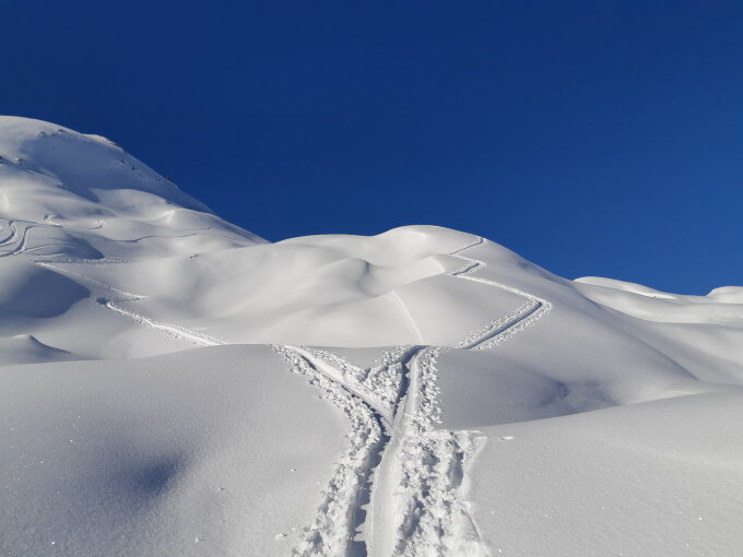 Alles Pulverschnee - oben noch viel Platz für eigene Spuren unten dann ziemlich zerfahren
