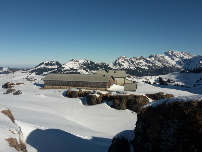 Start um 9:30 in Starkenbach. Hurtig den Selunerwald hoch zum Strichboden in die Sonne. Weiter über Gässli via Muelten hoch zum Tisch Pkt. 1832, Mulde queren in die Gipfelrampe. Auf steiler Spur hoch zum Gipfel. Yours truly fand Harscheisen im steilsten Abschnitt angenehm, die zwei anderen Tourengänger habens ohne geschafft (Merci für die Läckerli! :-) ) Gipfel sonnig mit etwas ungewohnter Aussicht, aber zugig. Abfahrt auf Aufstiegsroute bis Tisch in etwas griesigem Pulver auf Hartschneeauflage (kein Einbrechen), durchaus nett zu fahren. Anfellen und Wiederaufstieg unter den Gipfelhang vom Schären. Alles arg abgeblasen, Aufstieg bis zum Gipfel nicht mit Ski machbar. Steigeisen montiert und bis 1980m aufgestiegen: wenig Schnee, verblasen, Grashöcker. Die Aussicht auf weitere 200hm im gleichen Stil ("Dreck Tooling"?) bewogen yours truly umzukehren. Abfahrt vom Skidepot zurück zum Strichboden via Aufstiegsspur. Abfahrt vom Strichboden durch den Selunerwald. Stellenweise lugen langsam die ersten Steine hervor, desgleichen im Hang bei Hofstatt nach dem Wald, also Obacht.