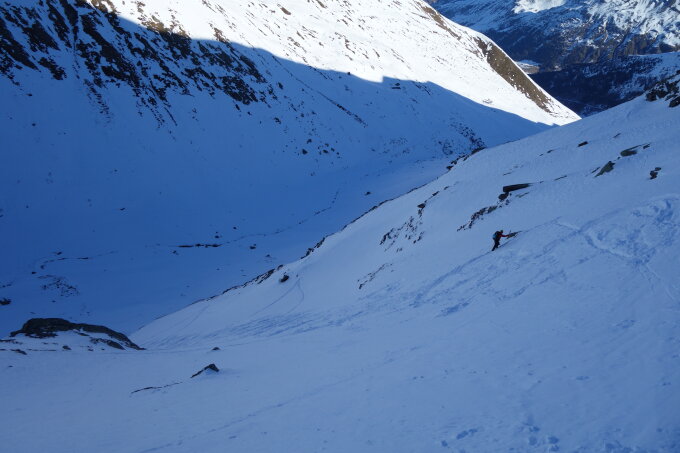 Der Schnee wird weniger, auf den Zustiegsstrassen schon Eisbildung und erste apere Stellen. Oben noch gut Schnee. Am besten noch die Hänge von Les Monts Telliers und im Tal des Torrent des Erbets (Pulver). Die permanent im Schatten liegende Nord-Seite der Pointe de Tenou hat erstaunlicherweise einige Eiskrusten. Die Südseiten haben ab 12.00 Firn.