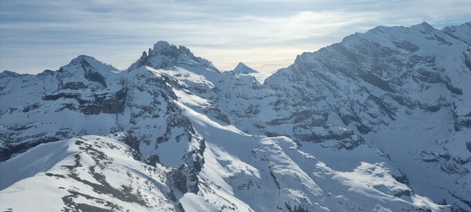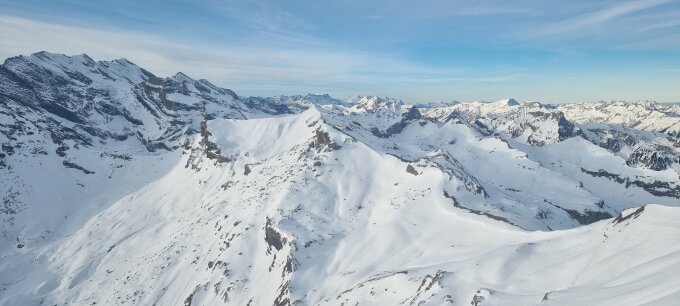 Von Stechelberg mit der ersten Bahn um 07.55 Uhr Richtung Schilthorn. Nach Kaffee und Nussgipfel im Drehrestaurant los um 09.30 Uhr. Mit aufgebundenen Skis dem Grat entlang bis zum Sattel bei Punkt 2798. Teilweise ausgesetzt, aber mit guten Trittspuren und Sicherungsseilen. Die Metalltreppe ist schnee/eisfrei. Ca. 45 Minuten. Von dort Abfahrt Richtung Rote Härd, etwas links davon vorbei bis die Felle aufgezogen werden. Aufstieg locker bis auf eine pickelharte, eisige und steile Stelle von ca. 50 Hm vor der Ausstiegswächte zum Gipfelplateau. Skis aufgebunden und Steigeisen montiert. Geht gut und sicher. Dann noch ein paar Schritte bis zum Gipfel. Rund drei Stunden ab dem Schilthorn, inkl. Pausen. Abfahrt über den wunderbaren Osthang hinab. Ganz oben finden sich einige lästige Eisplatten, dann aber Pulver vom Feinsten. Weiter bis oberhalb der Rotstockhütte. Dort anfellen und hoch zur Wasenegg auf ca. 2280 m mit der heissen Sonne im Rücken. Zum Glück liegt wenig Schnee, so dass aus den steilen Hängen von links keine Lawinengefahr droht. Leider folgt dann der Pflichtteil in unübersichtlichem Gelände mit teilweise üblem Bruchharsch runter nach Gimmelen und schliesslich auf der Piste nach Mürren. Insgesamt eine sehr schöne Tour bei wechselnden Verhältnissen, die einiges an Einsatz verlangt. Zwischen dem Schilthorn und Mürren waren wir über sechs Stunden unterwegs und haben ab dem Sattel keine Menschenseele mehr angetroffen.