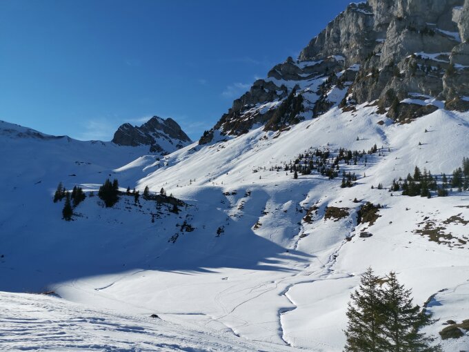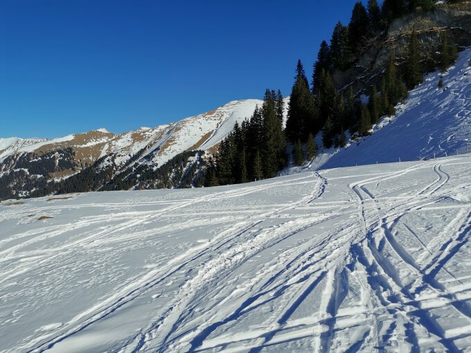 Es fehlt Schnee und nach zwei Wochen ohne Schneefall gleicht die Route bis / ab Abendmatte einer Piste. Trotzdem eine tolle Nachmittagsskitour bei schönstem Sonnenschein. Und der Neuschnee kommt ja bald.