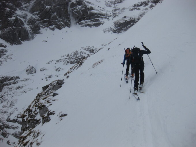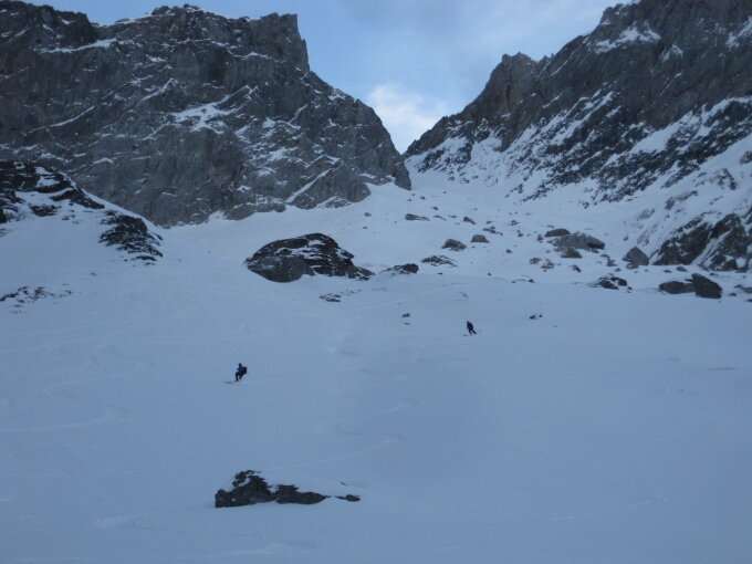 Wenig Schnee bis Walenboden. Kurze Tragstelle auf 2000 grad noch mit Ski machbar. Nachher problemlos bis zum Gipfelhang. Viel griesiger Triebschnee. Mühsam zum Spuren. Zwischendurch ging es einfacher zu Fuss. Weiter oben Presspulver. Gipfel stark abgeblasen. Abfahrt besser als erwartet. Couloir neben Gross Chalchhorn wäre heute gut machbar gewesen. Eine Fünfergruppe ist heute bis dort aufgestiegen und runtergefahren. Im untersten Teil viele Felsen und Steine, aber man findet schneereichere Passagen.