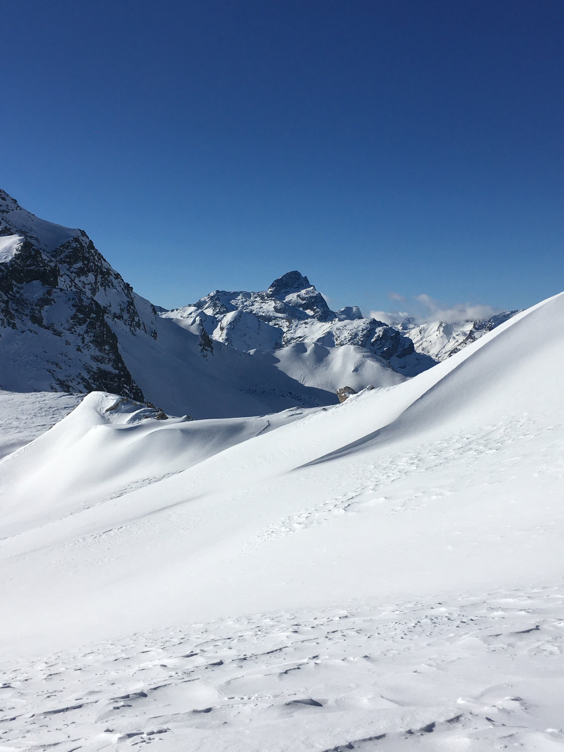 Start um 9 Uhr Parkplatz unterhalb La Veduta, minus 4 Grad, starker und böiger Nordwestwind auf der ganzen Aufstiegsroute. Bis Höhe 2500 m diverse Spuren, nachher selber Spur angelegt. Bin ziemlich hoch traversiert über dem Felsentor zur Fuorcla digl Leget und weiter bis Punkt 2766. Auf dem Kamm Crappa da Tocfs war der sehr starke und böige Nordwestwind fast nicht zum aushalten, sehr unangenehm. Aus diesem Grund verzichtete ich auf die letzten 100 Höhenmeter. Für die Abfahrt fuhr ich zur Fuorcla digl Leget und stieg mit Felle um den Punkt 2752 nordwärts herum für Abfahrtsrouten Piz Campagnung. War gute Idee, schöner Schnee und auch noch Sonne. Die Aufstiegsroute ist fast nur Traverse. Im unteren Teil Val d´Agnel pistenähnlichen Verhältnisse.