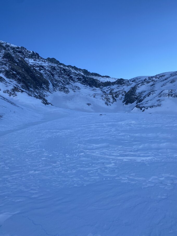 Rinne gut fahrbar, ganz oben ca. 30m nicht Schneebedeckt.