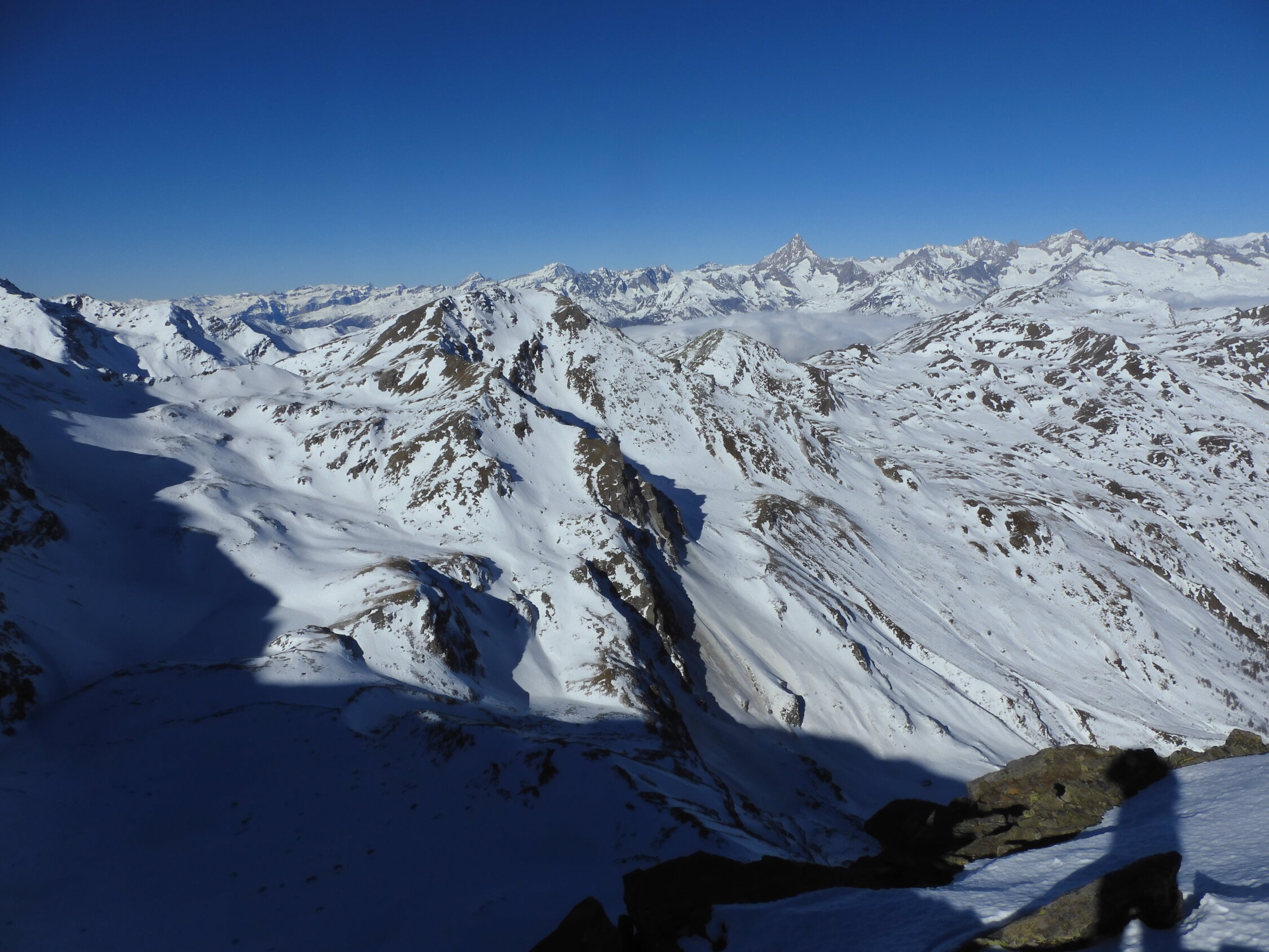 Starker bis stürmischer Wind begleitete uns auf dem gesamten Auf- und Abstieg. Schnee durchgänging windgepresst, wenige Male Bruchharst und an einige Stellen grobkörnig und dort für wenige Schwünge genussvoll. Abfahrt dito. Aufstieg retour nach Engiloch, Grund siehe Bild 3.