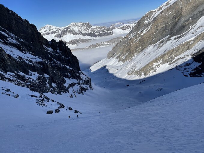 Schwarzgletscher war teilweise ruppig, weiter untern sogar noch Pulver.