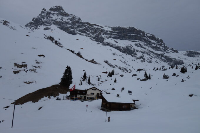 Abfahrt durch den Rachen zur Lindauerhütte: Es hatte Durchweg 20-30cm Pulver, kein Feindkontakt auch wenn die Schneemenge nicht alle Felsen überdeckt. Eine Engstelle hat es bei ca. 1700m wo evtl. die Ski abgezogen werden müssen. Weg ist teils mit Stangen markiert.