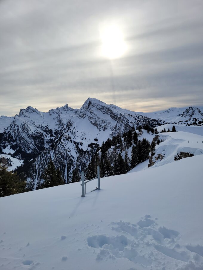 Im unteren Teil hats in den Neuschnee geregnet, drum ist es gedeckelt. Oben etwas besser, aber viel Wind und zu warm.