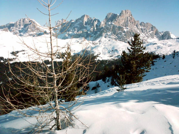 Auch der Sonntag präsentierte sich strahlend blau vor der atemberaubenden Kulisse der Palagruppe. Diesmal haben wir uns für einen nordseitigen Anstieg entschieden, mit Sonne im Gesicht und tollem Schnee vom Gipfel bis ins Tal. Recht steil geht es nach der Malga Colbricon in etlichen Spitzkehren durch ein Waldstück hinauf. Oberhalb der Waldgrenze treffen wir auf traumhafte, hindernislose Nordhänge, die sich noch ordentlich weit zum Gipfel hinauf ziehen. Ein richtiger "Colbricon", der den Zusatz "Piccolo" eigentlich gar nicht verdient hat. Die Abfahrt ... super! Vor allem im steilen Waldstück war es ein kurvenreiches auf und ab und teilweise ging es wie in einer Bobbahn wieder hinunter bis zur Rollepaßstrasse.