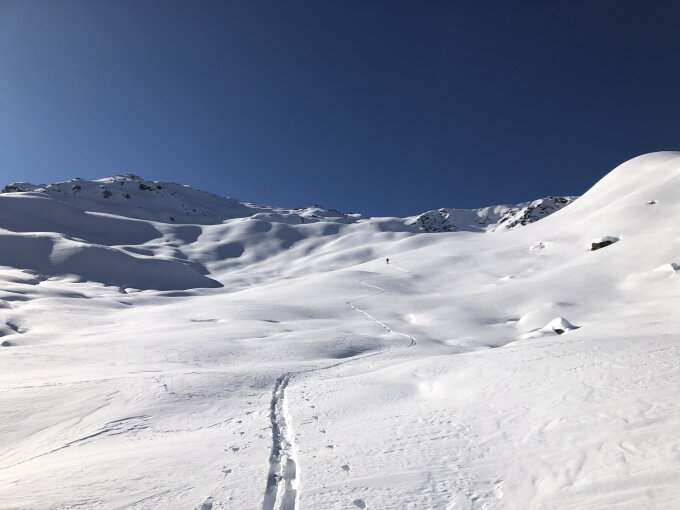 super Pulverschnee schattseitig; in der Sonne bildete sich ein unbedeutender Deckel. An der gegenüberliegenden Talseite sind ab Heimspitze bis Matschuner Joch bei fast allen + 30 Grad Hängen Lawinen los gegangen. + 30 Grad Hänge sind auf Grund von Schneefrachtungen etwas für unerschrocken Mutige. Da die letzten Hänge Richtung Schneeberg noch nicht ausgelöst haben - Umkehr.