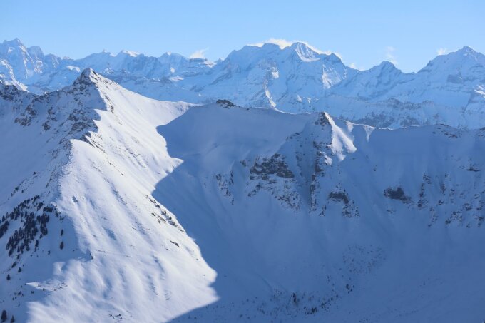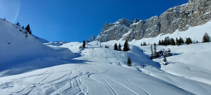 Abfahrt: In der Flanke bis zum Grimmifurggi hat es meistens Pulverschnee. Danach bis Alp Grimmi ist es wechselhaft mit harten Stellen und Pulverschnee. Der Waldweg ist gut eingeschneit und gut zu fahren.