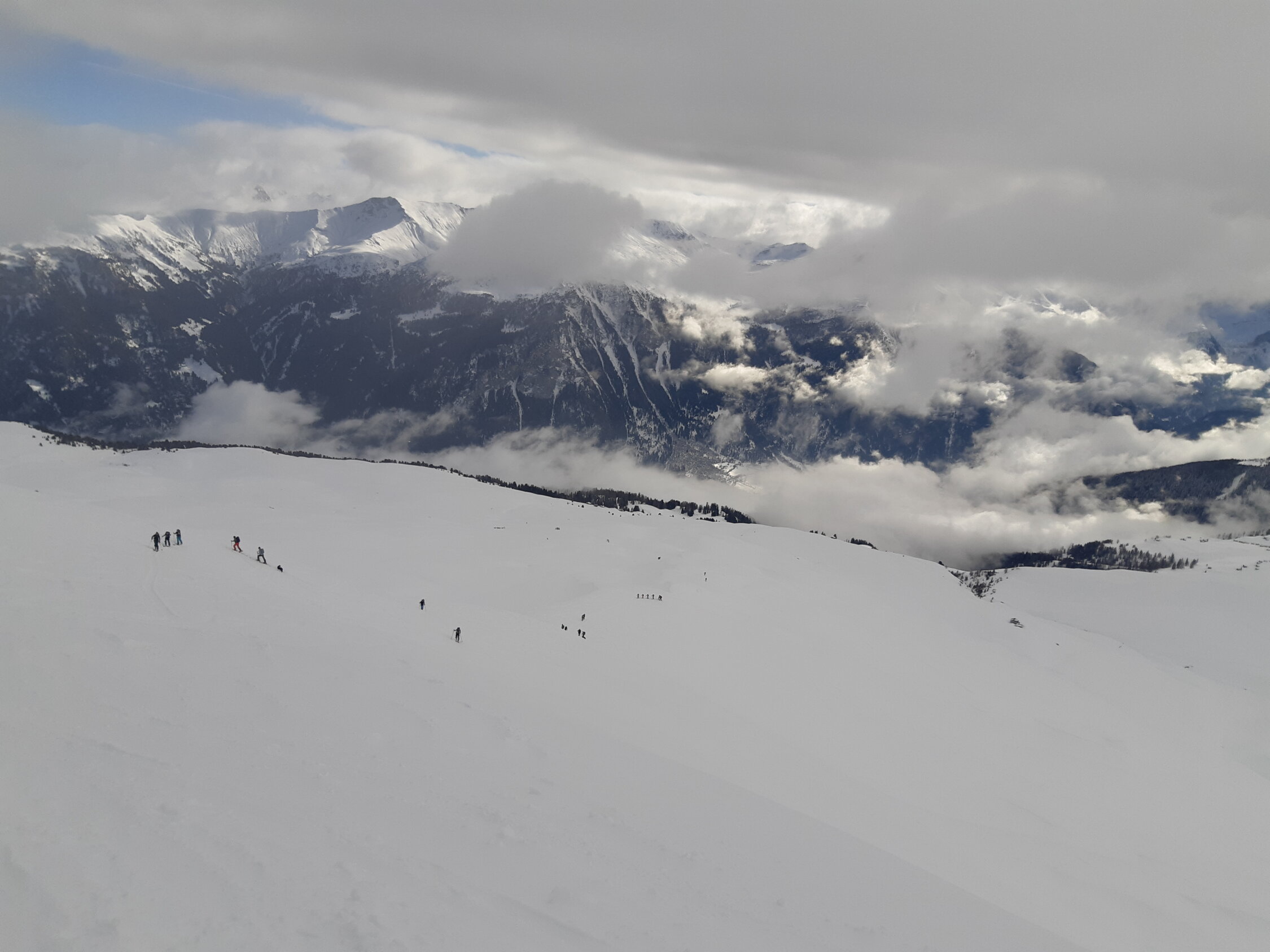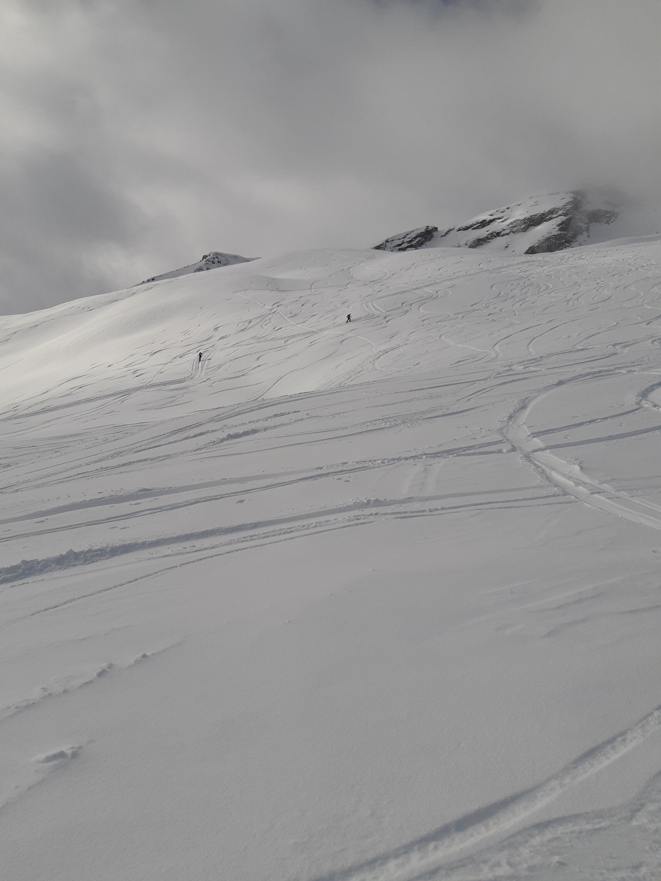 Pulverschnee im Wechsel mit Bruchharsch...Oben mehrheitlich Powder, weiter unten dann zunehmend Bruchharsch....Alles in allem gut zu fahren...heute gab's noch Platz für eigene Spuren...wird aber angesichts der vielen Menschen schnell knapp werden..