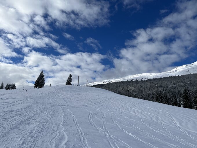Start im Nebel, der sich aber schnell auflöste. Rest der Tour in der Sonne und schön warm, nur kurz zwischendrin etwas zugig. Ski können hinter der Brücke angeschnallt werden. Bis nach Alp Schlund hat es anscheinend reingeregnet, hier hat es nassen und eher harten Schnee. Drüber hat es etwa 5cm Powder auf harter Unterlage. Gut zum Aufsteigen und auch sehr schön zum Abfahren. Aber von 80cm Neuschnee ist nichts zu sehen. Trotz der Massen hat es doch immer noch Platz für eine eigene Spur.