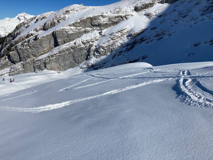 Auf der harten Unterlage fanden wir einen wunderbar fahrenden Pulverschnee von wenigen Zentimetern vor. Im Schlussaufstieg zur Scharte waren wenige gefrorene Stellen vorhanden. Wir erlebten eine gefahrlose, stimmungsvolle Skitour.