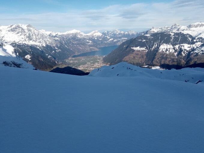 Gute Aufstiegsspur. Abfahrt schöner Pulver, selten harte Unterlage. Kein Steinkontakt, gut eingeschneit. Am Gipfel wenig Wind, sonst praktisch kein Wind. Sicht im Mittelteil etwas diffus. Abfahrt via Butzenboden, wenige Spuren von gestern, paar von heute.