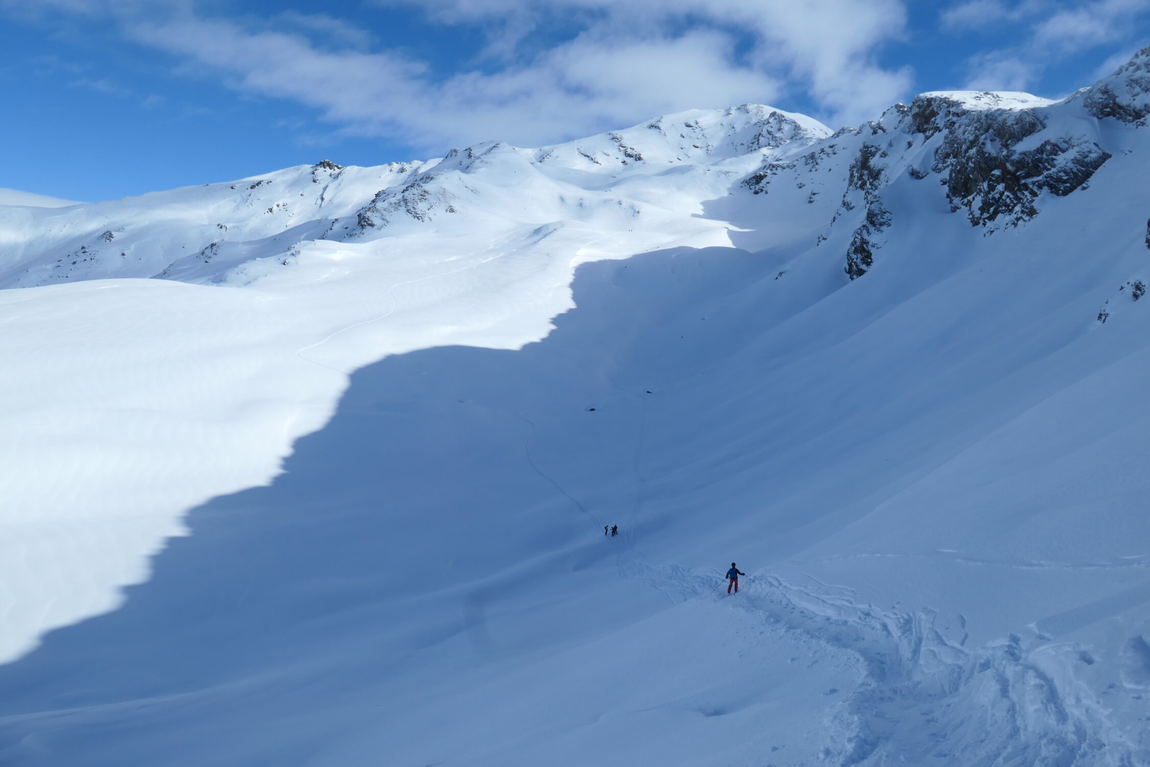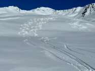 In der Abfahrt verschiedene Schneearten, teils Pulver, teils Deckel, teils Hartschnee.