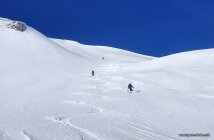 Abfahrt: Oben in den Mulden ab und zu windgepresst, aber schön zu fahren. Die Verhältnisse können engräumig schnell wechseln. Dann wieder tolle Passagen mit Pulverschnee. Die Spuren vom Vortag waren wieder ganz zugeweht. Unten wurde der Schnee schon etwas feucht.