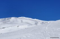 Sonnig und warm. Auf dem Gipfel etwas Wind. Es hat ca. 10 cm Pulverschnee auf gut tragender Unterlage. Oberhalb des Waldes sind immer noch Kuppen und einige Hänge schneearm. Doch in den Mulden ist es toll.