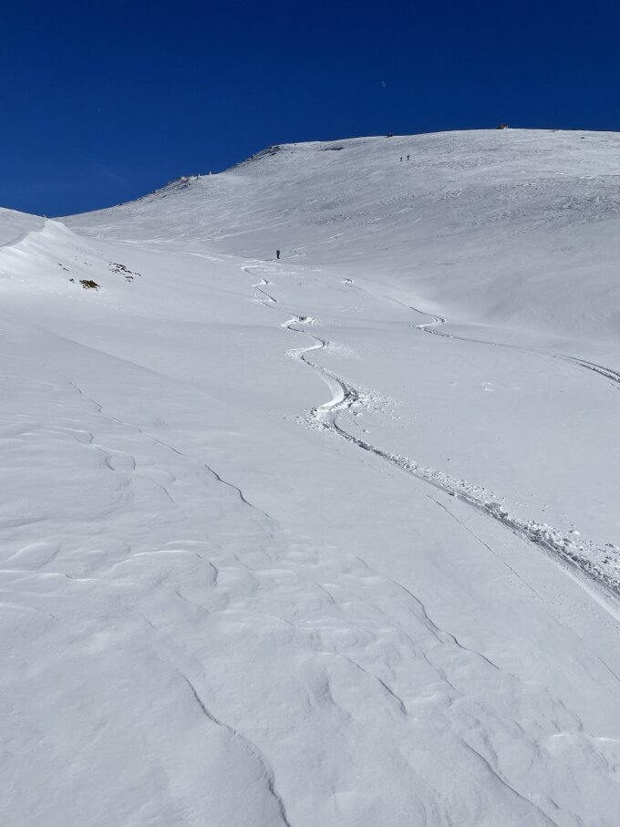 Aufstieg tiptop auch beim Schneeschutrail. Der Wind am Montag hat von oben bis unten ziemlich gewirkt. Unten auch der Regen, leider. Abfahrt zuoberst wie Piste, dann Presspulver fahrbar aber zunehmend vor allem Press und weniger Pulver: schafig bis Chäserstatt. Von dort kann man auf die Piste/Waldstrasse ausweichen. Unterhalb 1500 dann mehr Bruchharst und zT auch schon nass. Je nachdem was man erwartet hat ist das Smiley eher gelb…