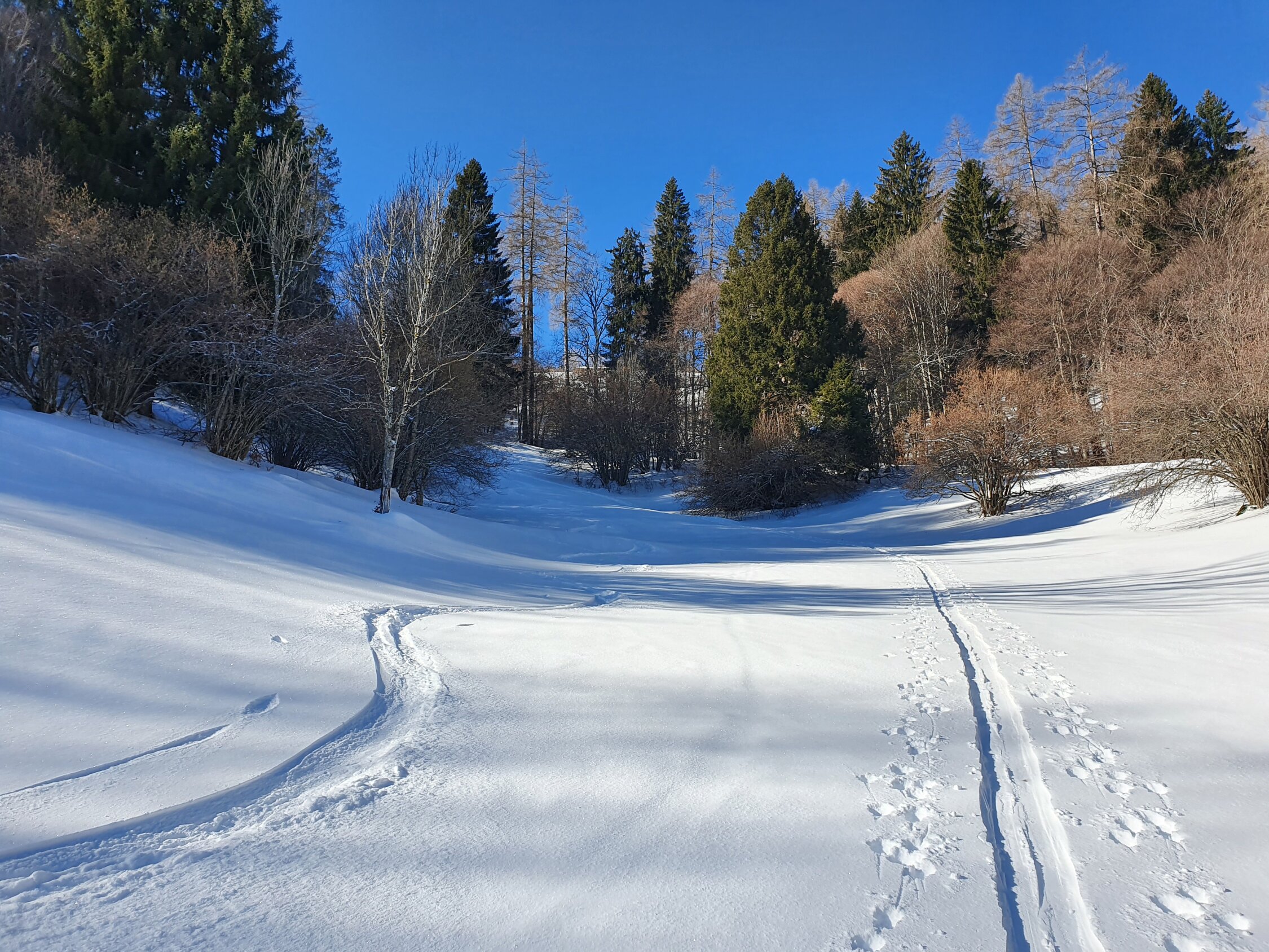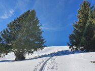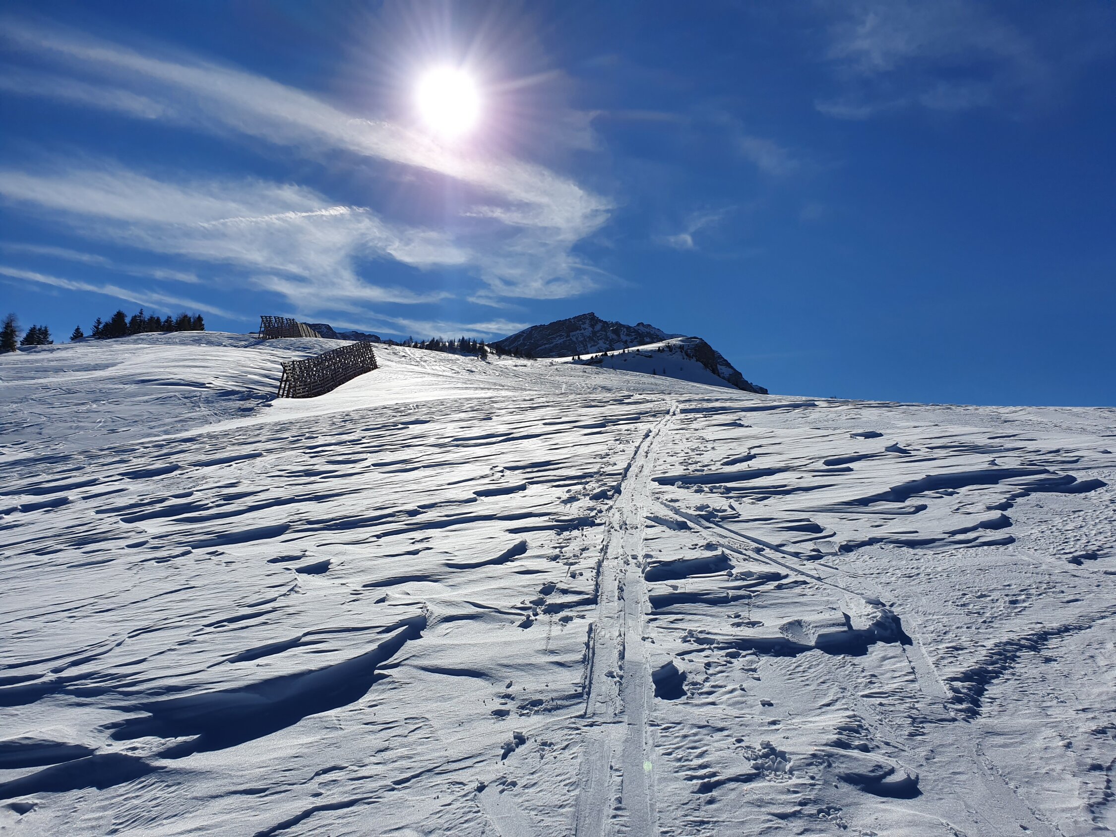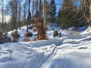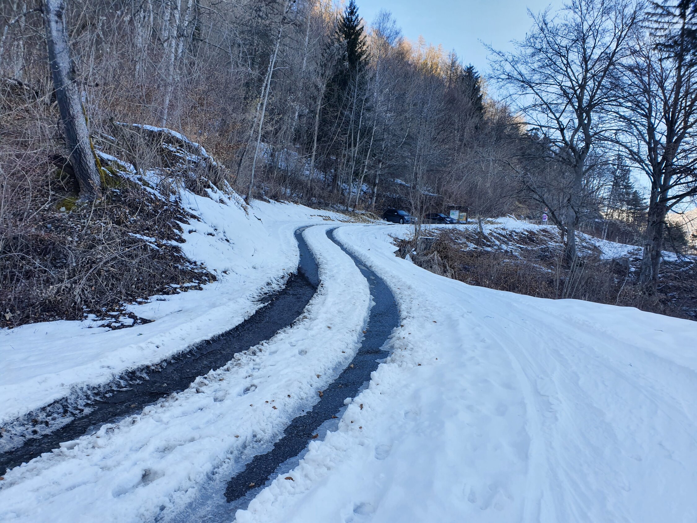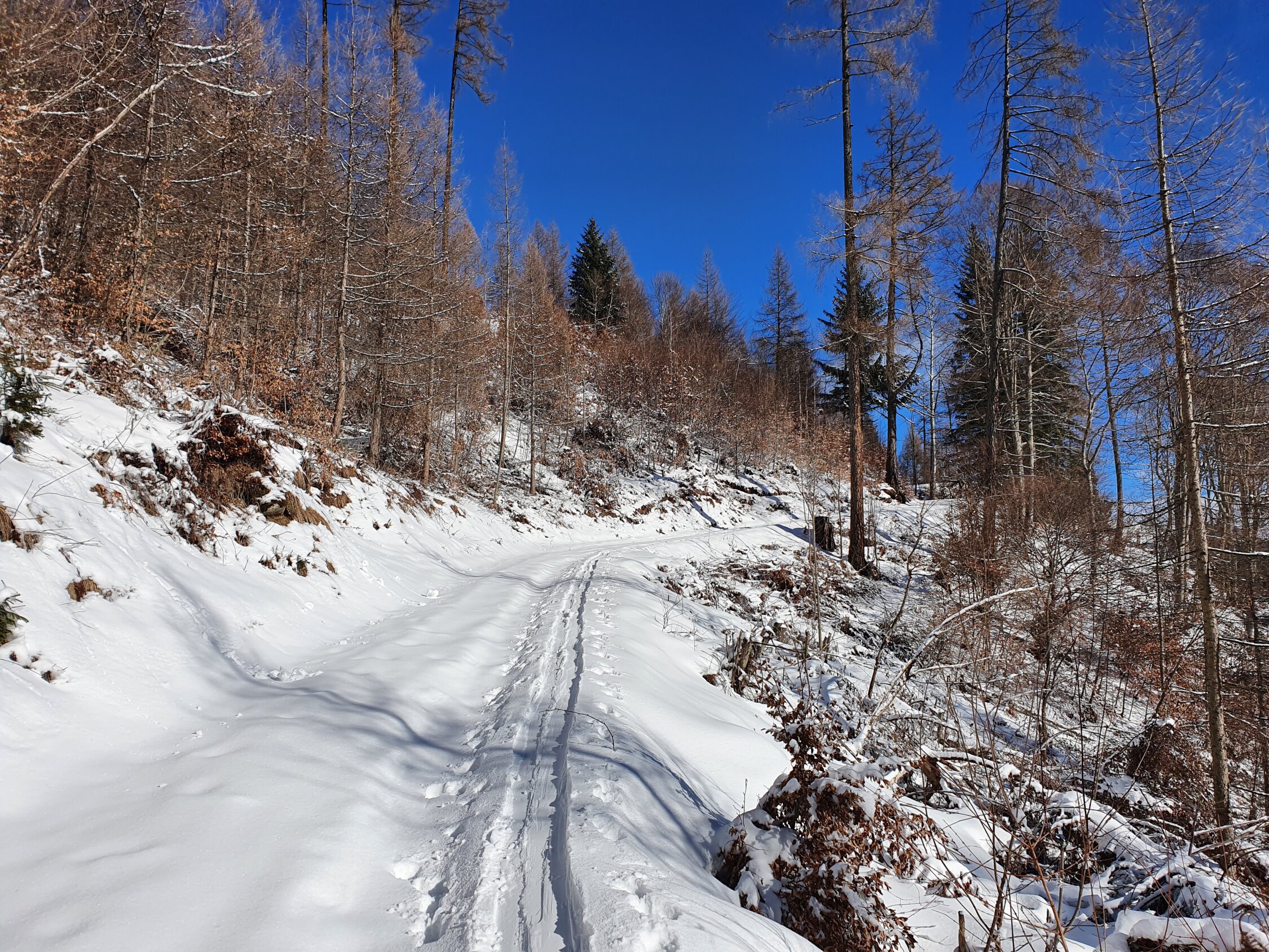 Zuoberst war der Schnee stark windbearbeitet, ab P1776 dann bis P912 Pulverschnee, danach weiter auf dem Forstweg.