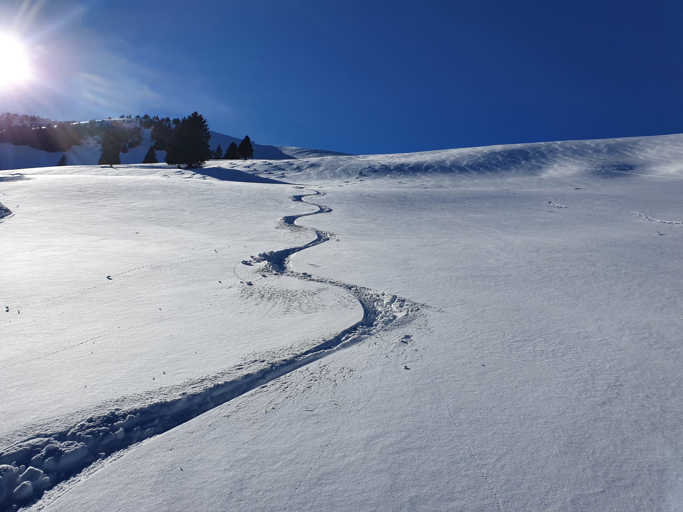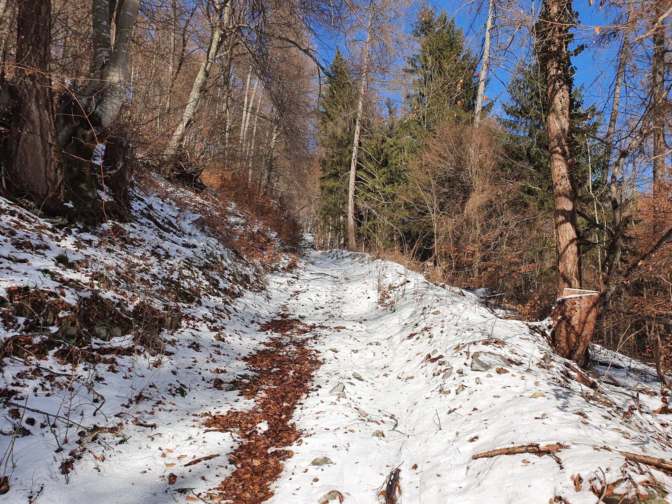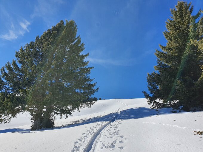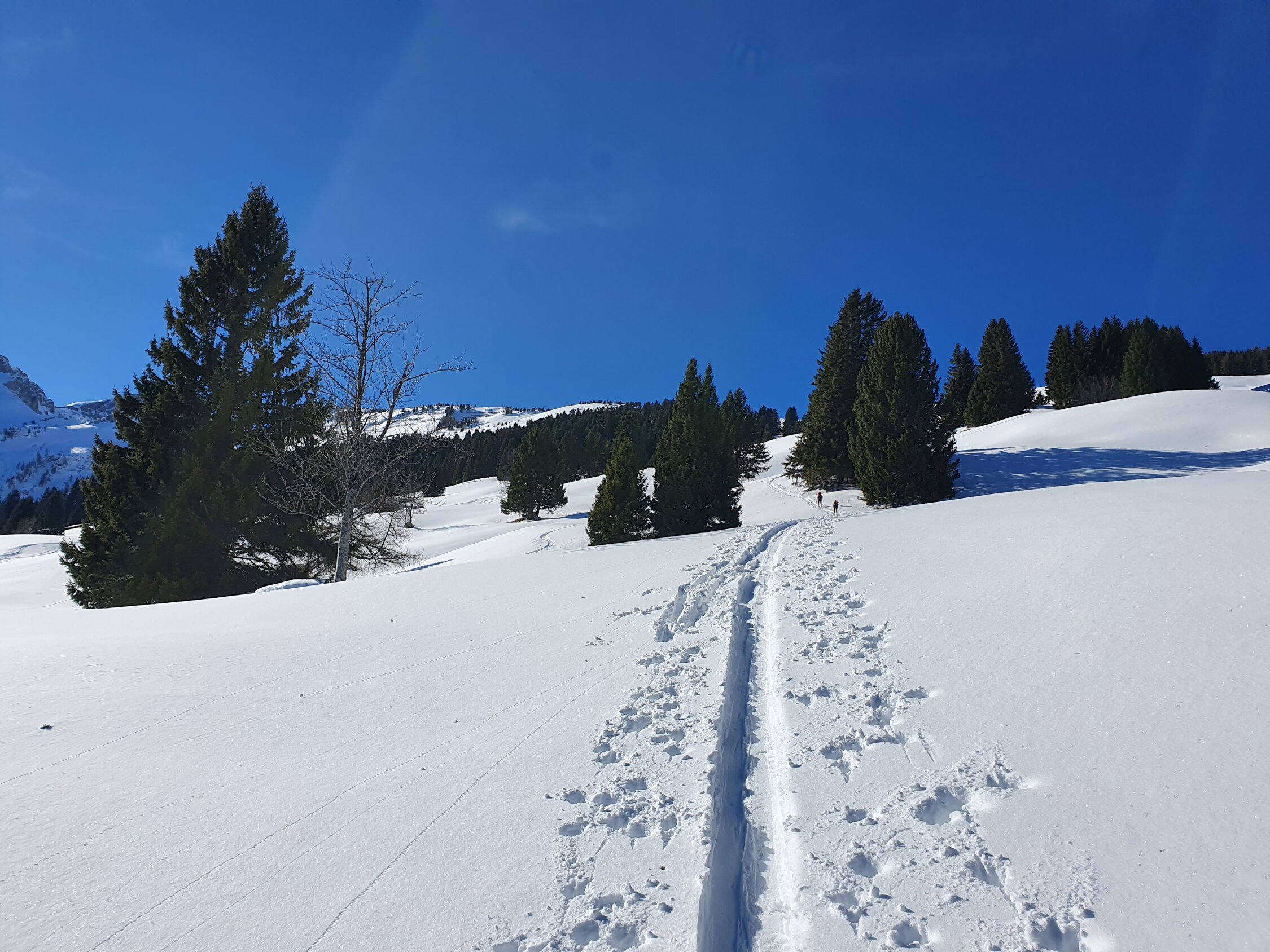 Zuoberst war der Schnee stark windbearbeitet, ab P1776 dann bis P912 Pulverschnee, danach weiter auf dem Forstweg.