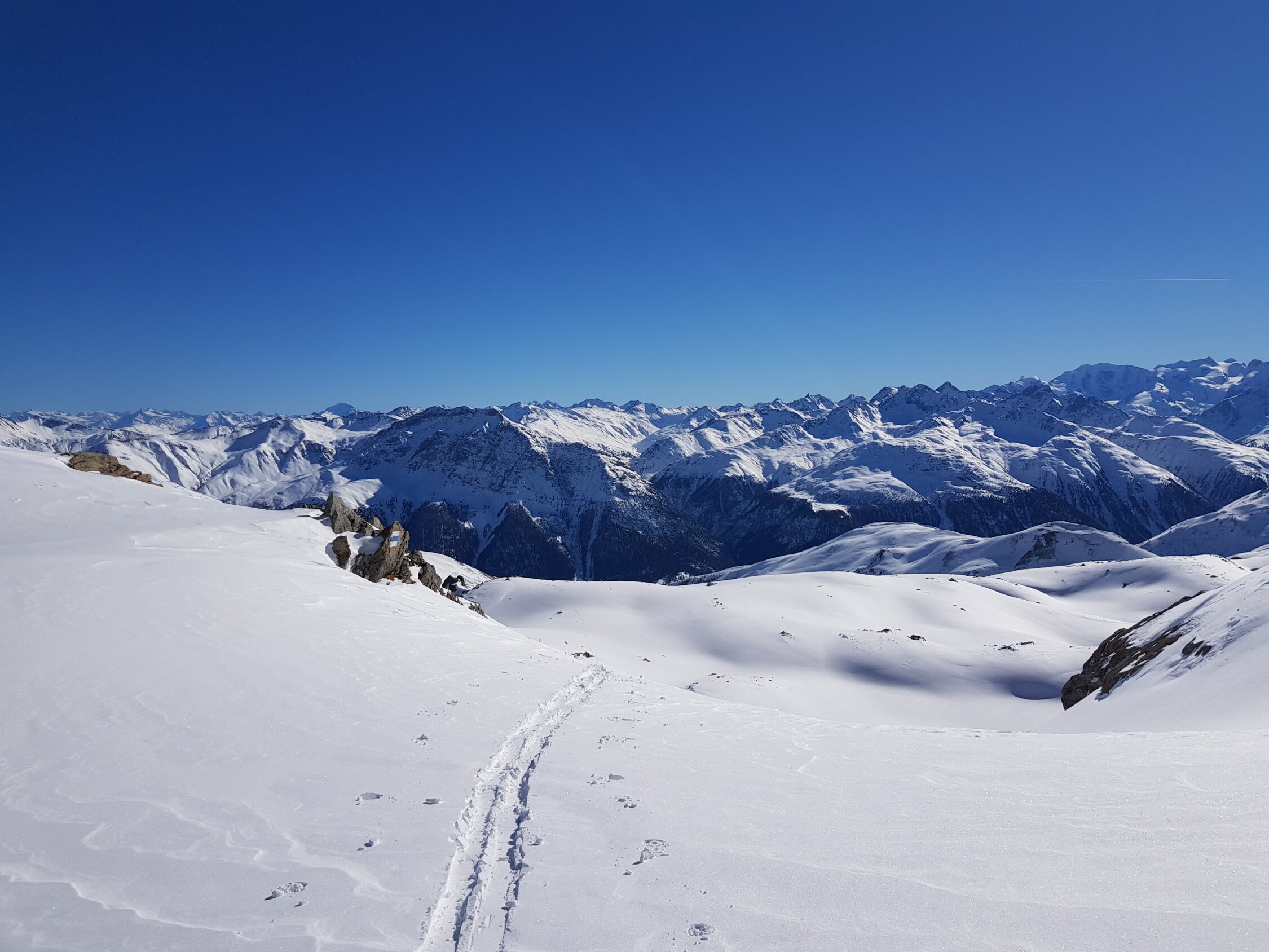 Start in Madulain, erstaunlich guter Schnee, obwohl vor 2 Tagen Sturmwinde, Presspulver überall sehr gut fahrbar.