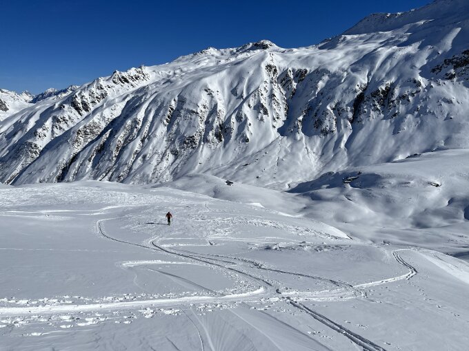 Eigentlich wollten wir heute den Tälligrat machen. Da der Schijenboden (ab Stelliboden) aber komplett abgeblasen war (Bruchharsch und z.T. fast "Blankeis") sind wir noch Richtung Rottällihorn gequert. In den nordöstlich ausgerichteten Rinnen liegt hier aber noch schöner Powder. Zwischen diesen Rinnen ist es aber auch immer wieder plattig/eisig. Je weiter man runter kommt, desto einfacher findet man den Schnee. Zu steil sollte man ostseitig aber nicht abfahren - am oberen Teil des Stellibodenbach ist wohl vor ein paar Tagen eine grosse (hoffentlich Spontan-)Lawine abgegangen.