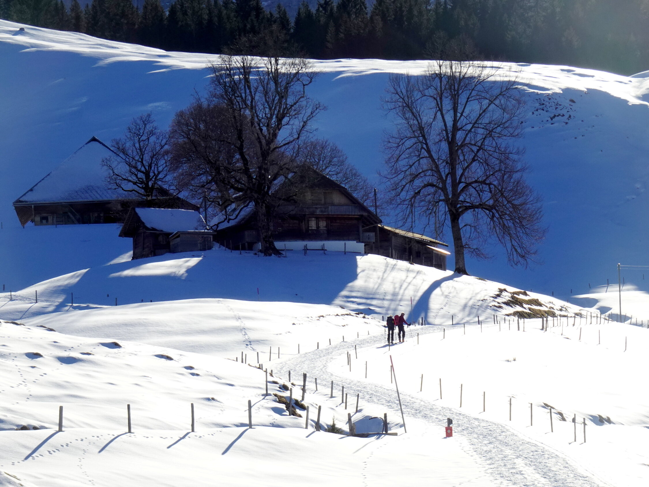 Von Linden bis zum Vorderschöriz könnte man problemlos ohne Schneeschuhen gehen. Sobald man beim Stouffe beim Steilhang um die Flanke zum Hüttli geht, hat man eine harte, glasige Kruste. Schneeschuhe oder Harscheisen an den Skis sparen viel Mühe. Der Abstieg nach Eriz Säge ist so gut abgetreten, dass gute Bergschuhe genügen würden. Fazit der heutigen Tour, der Teileinsatz der Schneeschuhe bringt Erleichterung.