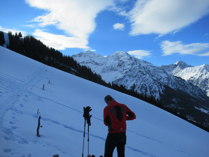 Herrlicher Sonnenschein. Im Aufstieg bis zum Gipfelgrat ein Harschdeckel vorhanden