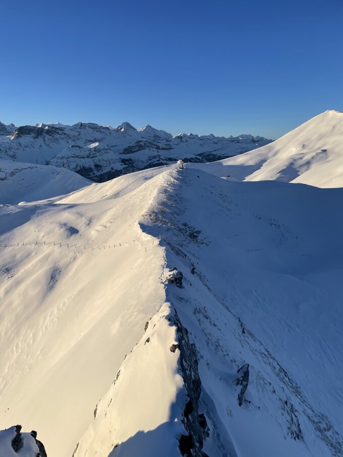 Ersraunlich gut eingeschneit, es hat aber versteckte Steine. Bis fluonalp lag eine Spur, danach problemlos in 10-20 cm Pulver gespurt. Oberster Hang ein Traum, misstönige Gerade 2x fahren.