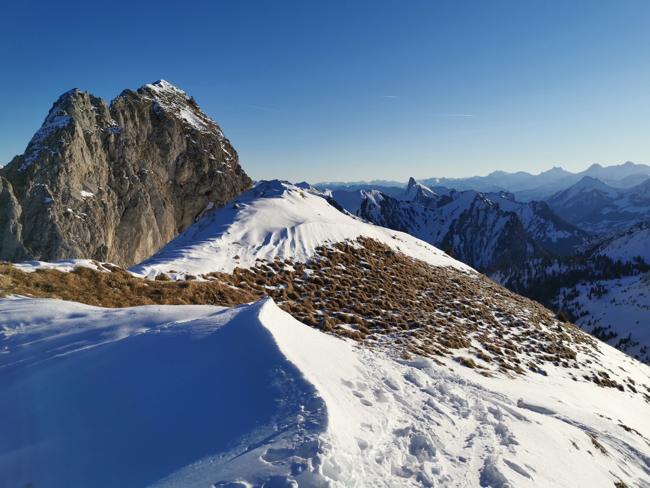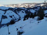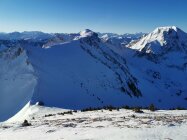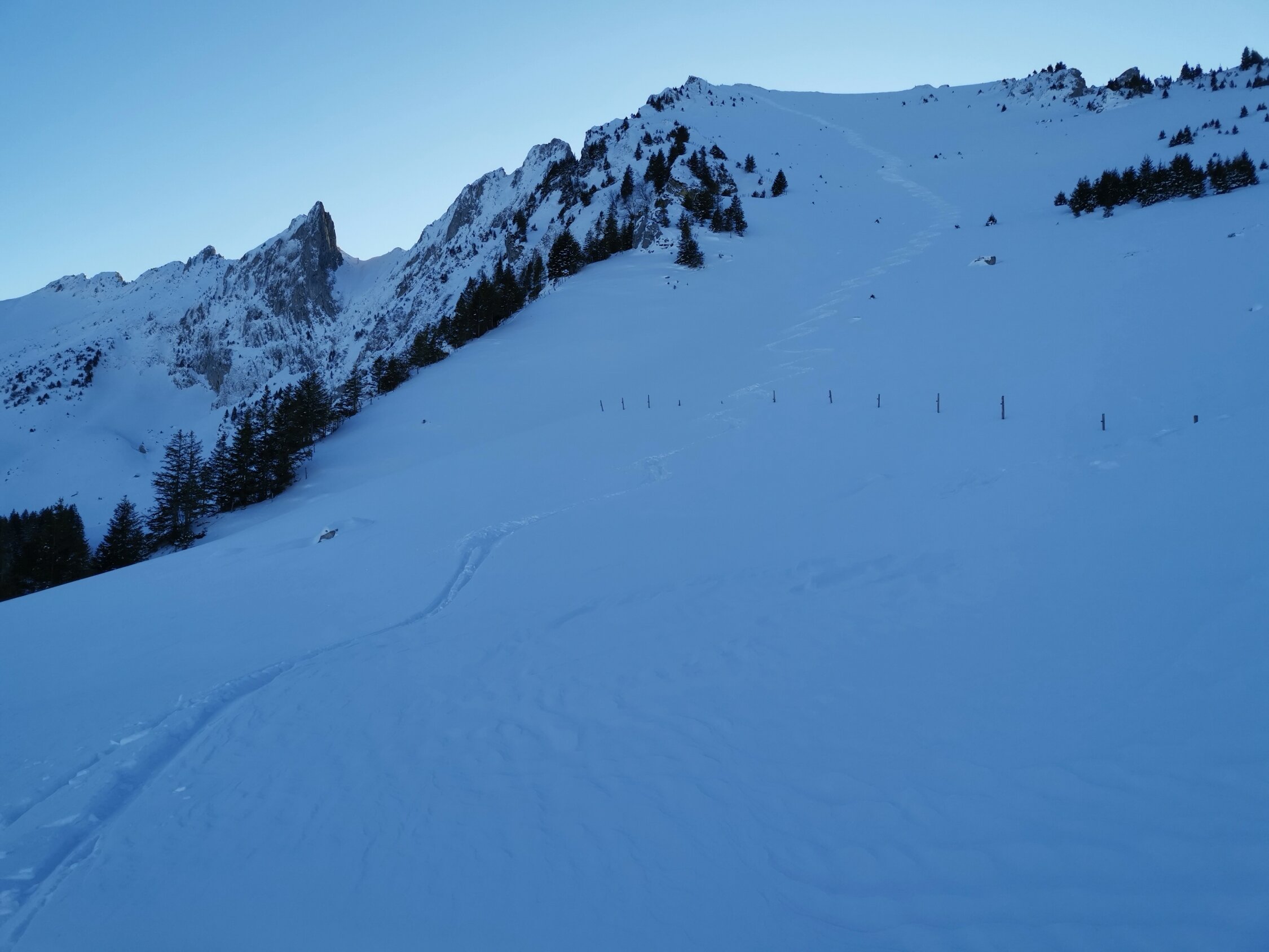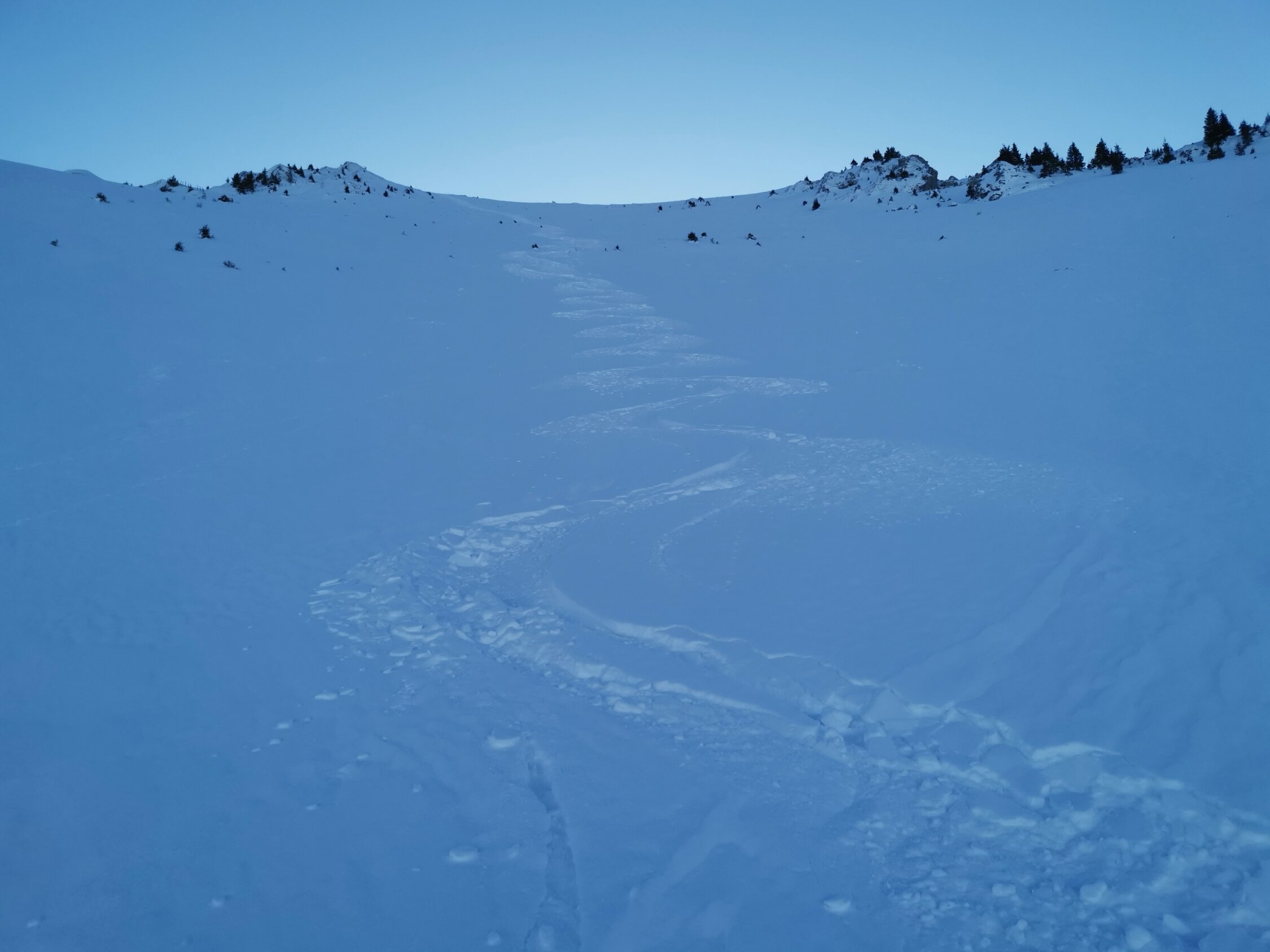 Start um 6:30 in der Hengstkurve bei -10 Grad. Im Aufstieg teils Pulver, süd- und südwestseitig bereits Bruchharst, der aber sehr gut zu gehen war. Abfahrt Firstline über die mit 15-20cm Pulver gezuckerte Tagweid. Mit umsichtiger Fahrweise lassen sich auch unten Steinkontakte vermeiden.