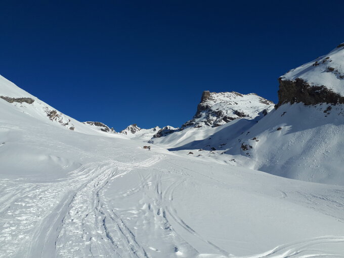 Dank dem wenigen Neuschnee von Gestern angenehme Aufstiegsspur. An windgeschützten Stellen schöner Pulver, ansonsten windgeprägt.