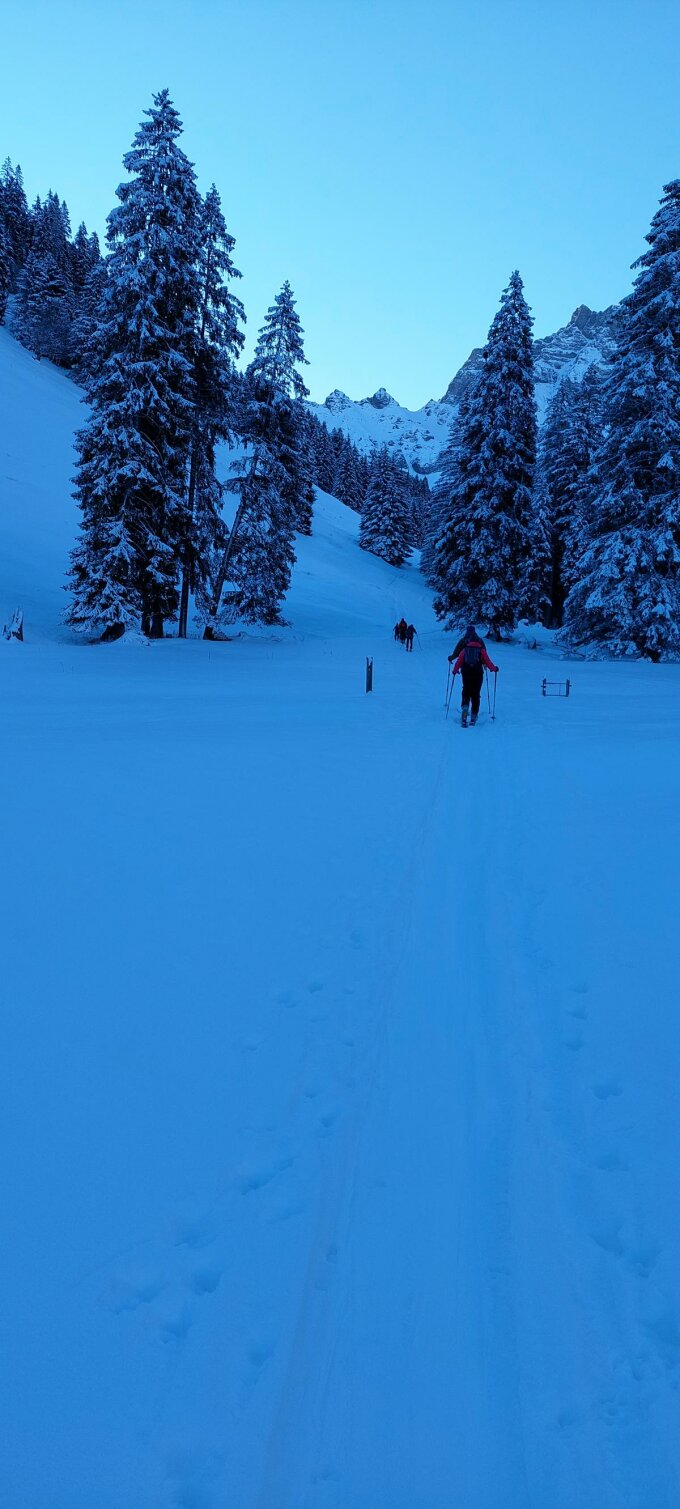Aufstieg: Vom Hindere Fildrich links haltend den Wald hoch. Der Weg ist gut eingeschneit und kann mit Skis begangen werden. Ab einer Höhe von ca.1900 m ü. M. hat die Spur immer wieder Stellen, wo der untere Ski wegrutscht. Aus diesem Grund habe ich auf einer Höhe von 2200 m ü. M. die Harscheisen montiert. (Es geht aber auch ohne)