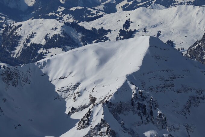 Abfahrt: Es hat von oben bis unten Pulver. Der Gipfelhang ist etwas ruppig zu fahren. Unter dem Neuschnee hat es eine alte Lawine. In den Westhängen Richtung Erbithore und dann hinunter Richtung Oberberg hat es super Pulver. Dort linkshaltend Richtung Steibode und Fildrich bis zum Parkplatz immer noch Pulverschnee.