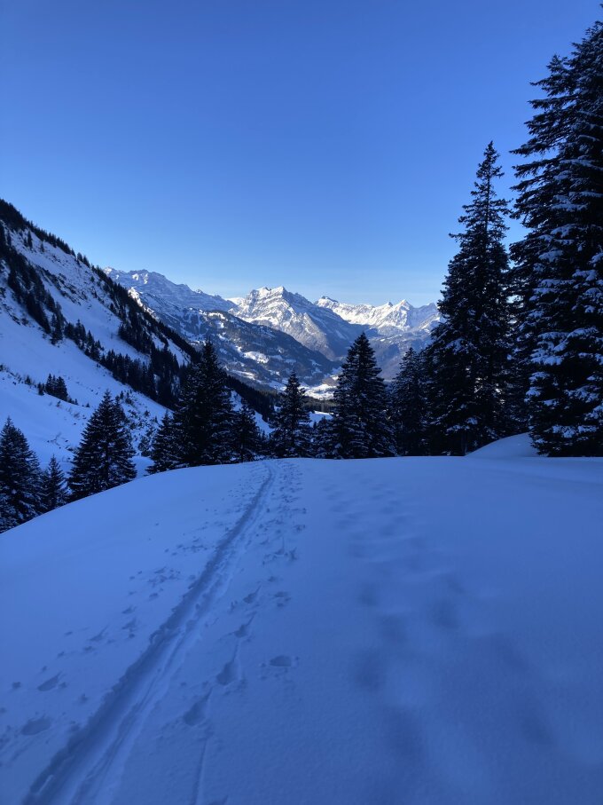 Beim Aufstieg zeichnete es sich schon ab, es wird eine super Powdertour heute, der Aufstieg ist grösstenteils im Schatten und natürlich die Abfahrt auch. Steil empor Richtung Gipfel, im obersten Teil auf dem Grat empfängt uns die wärmende Sonne. Auf dem Gipfel fast Windstill. Abfahrt via Platte in Traumpulver. Zum Abschluss noch gemütlich mit dem Arvenlift hochgefahren und so zurück zum PP Leistchamm.