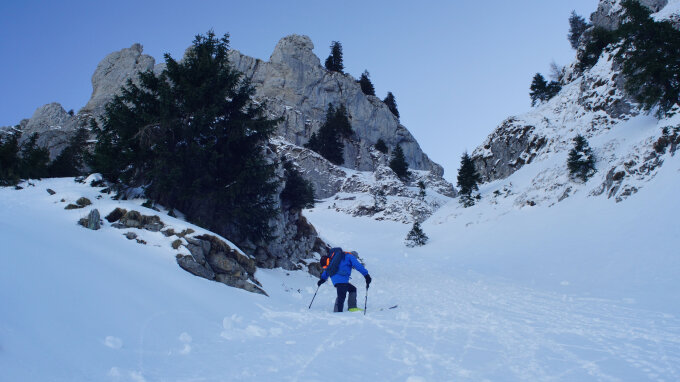 In der engsten Stelle im Couloir haben wir in der Abfahrt ein Seil reingehängt, weil es kurz über einen Felsen runter geht. Oberhalb hat es eine Tannengrotze die sich als Verankerung eignet. 40m Seil reichen gerade gut aus.