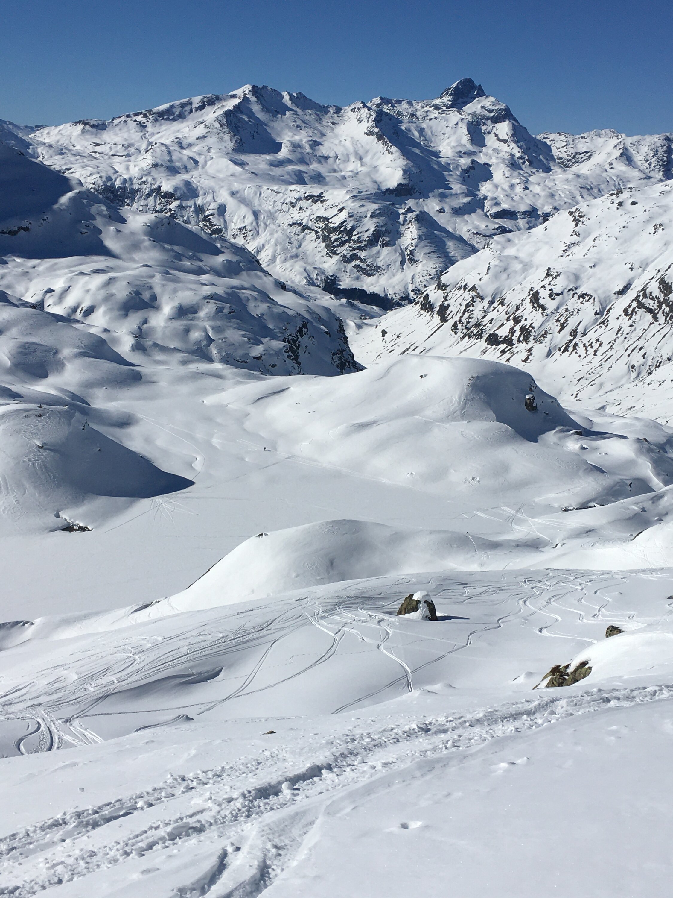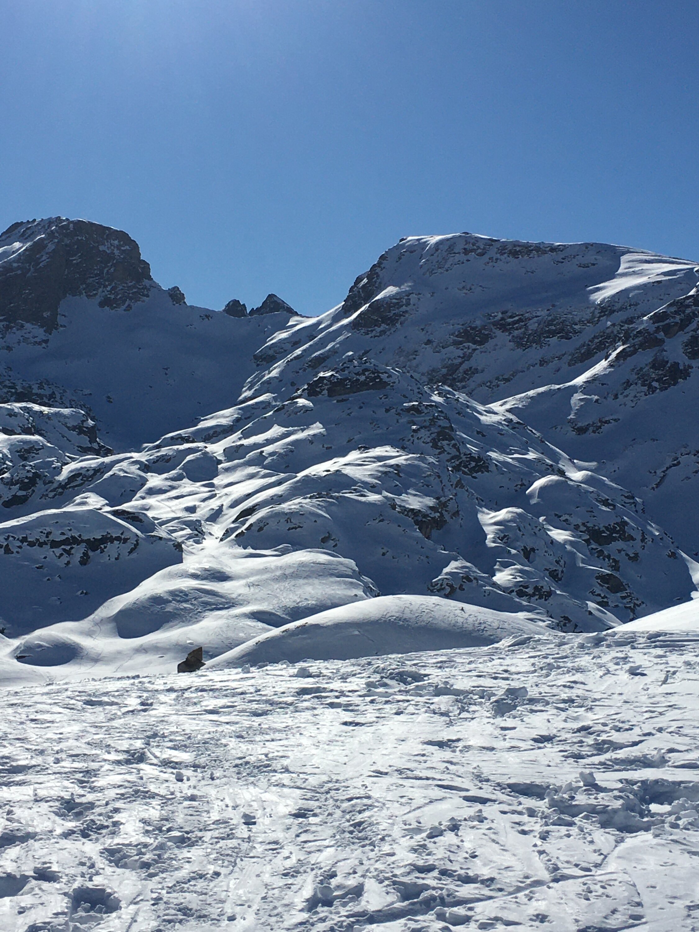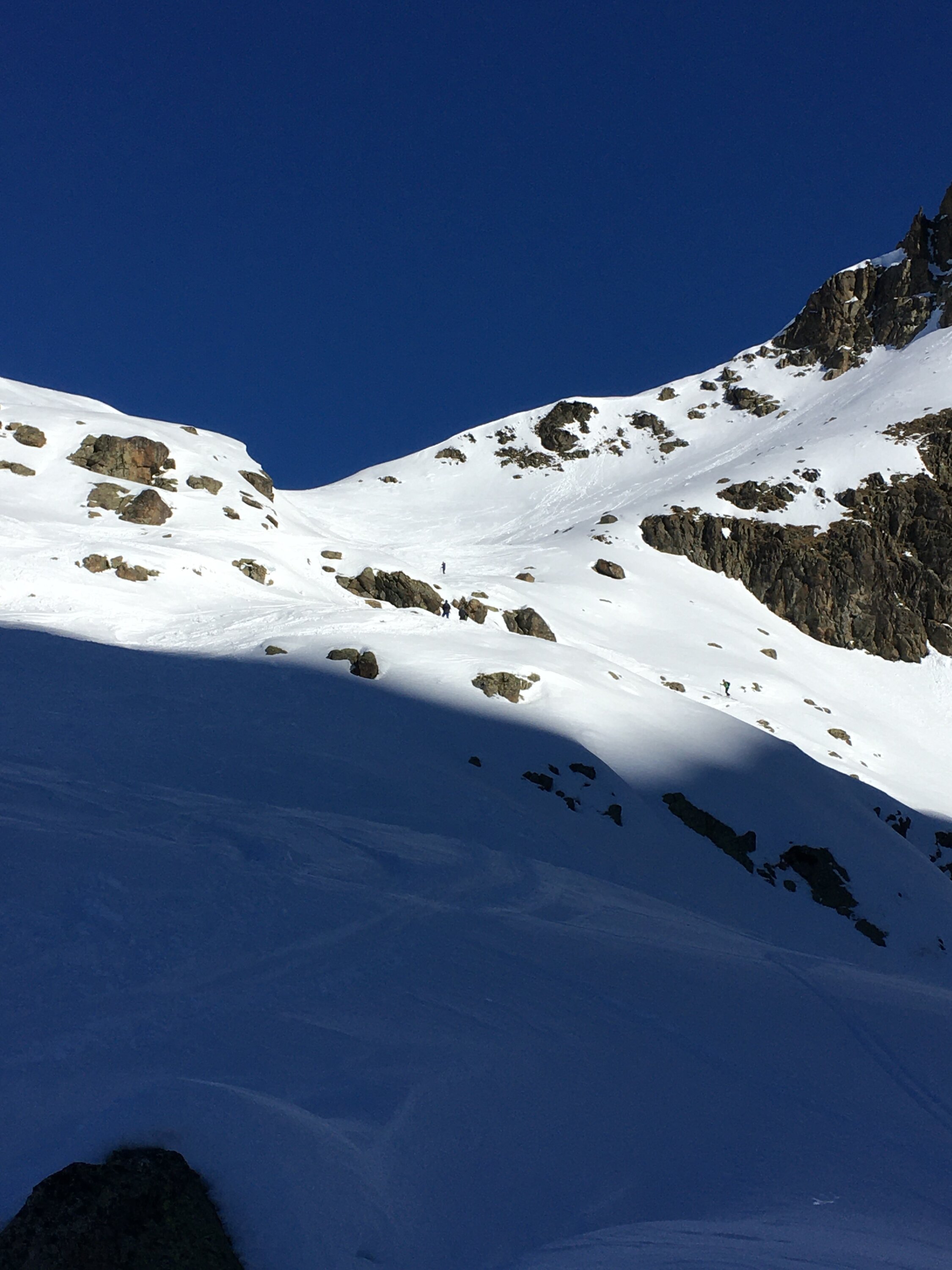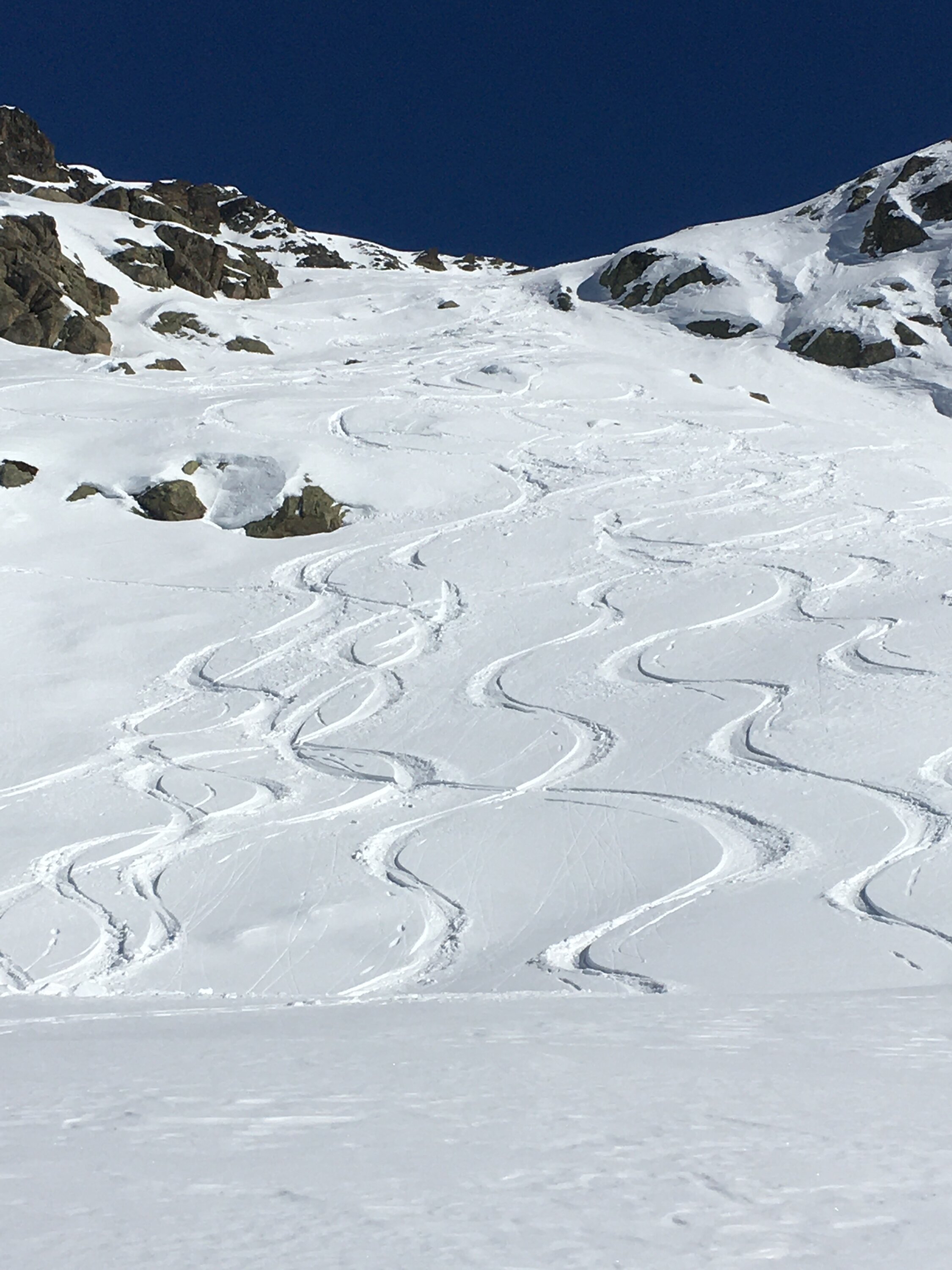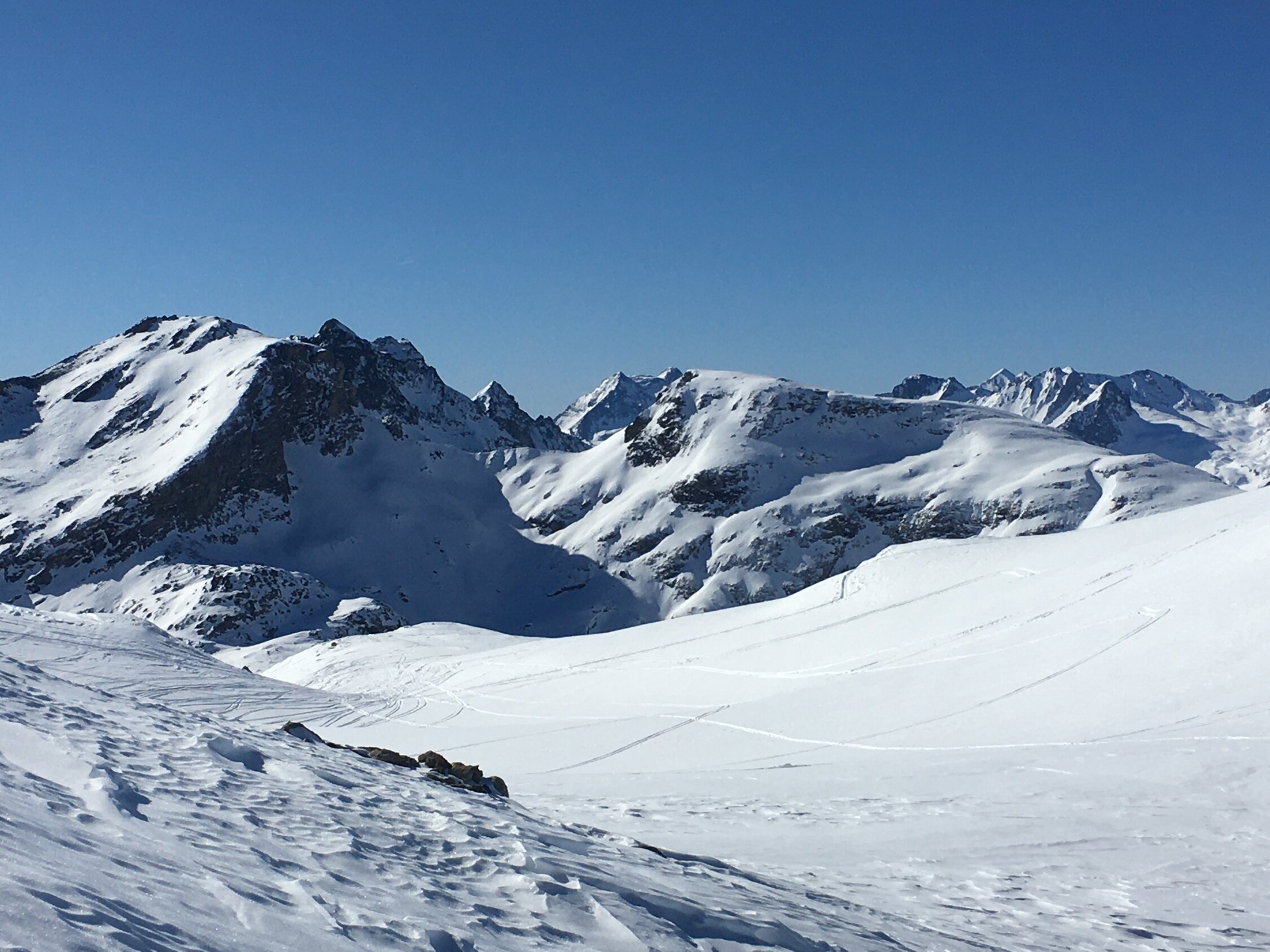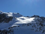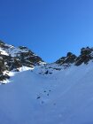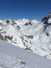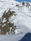 Start um 8 Uhr Parkplatz La Veduta, minus 14 Grad, starker Südwestwind. Perfekte Spur bis zum grossen Plateau unterhalb Punkt 2802. Pickelhart, Harscheisen bei Start montiert. Bis Höhe 2650 m Schatten im Aufstieg. Nachlassender Wind. Nach Plateau etwas hinunter zum anfangs breiten Südaufstieg auf den Pfeiler, im Gipfelbereich schmal und ausgesetzt. Mit Ski bis zum Gipfel und wieder mit Felle zurück zum Plateau. Abfahrt im oberen Teil Bruchharst, ab Höhe 2650 Pulverschnee, schon viele Spuren, man findet aber noch unverspurte Stellen. Traverse mit kurzer Gegensteigung und entspannter Abfahrt ab Punkt 2449 zur Veduta. Parkplatz überbelegt mit italienischen Kennzeichen. Auch die anderen Parkplätze waren alle überbelegt.