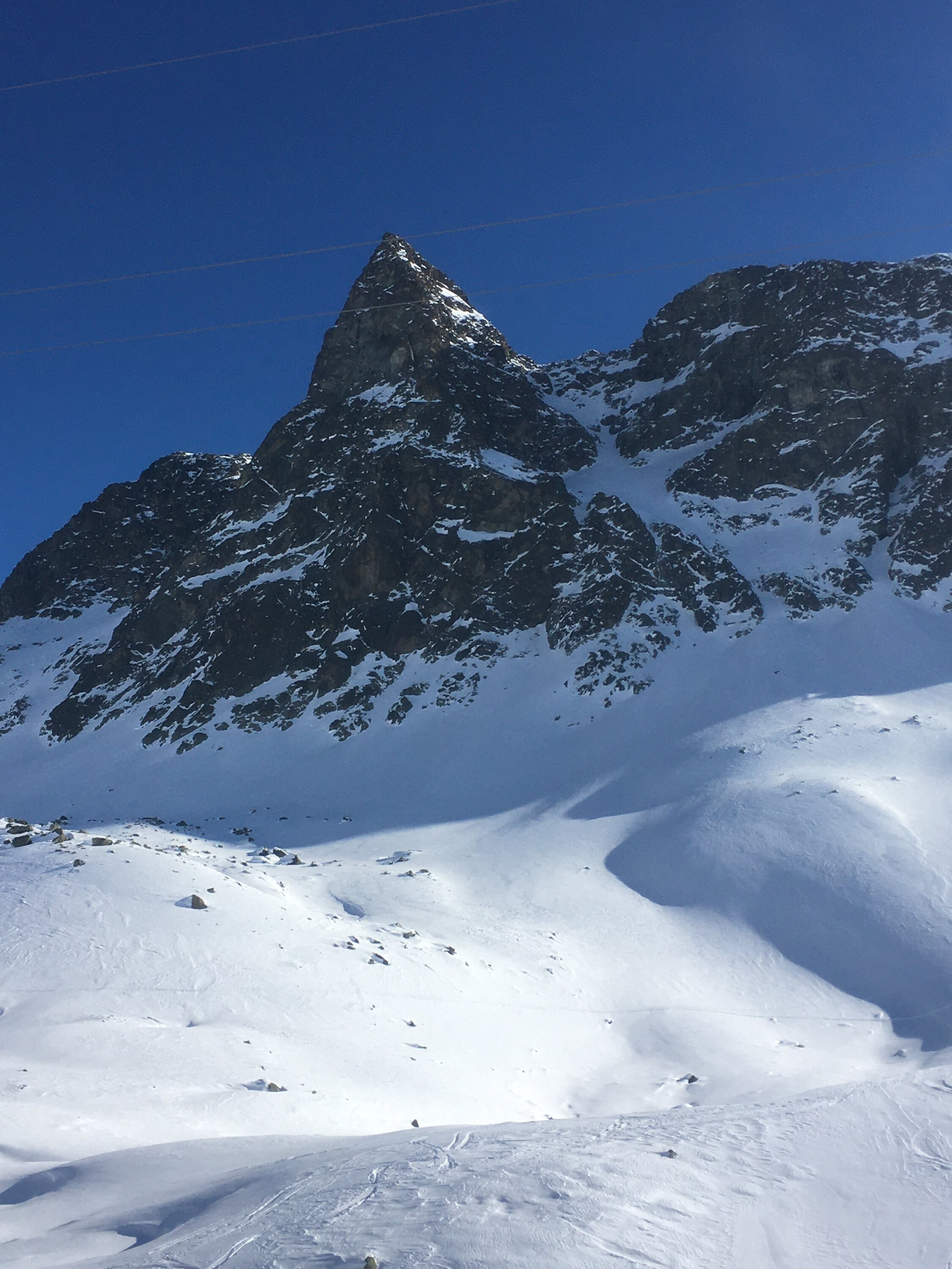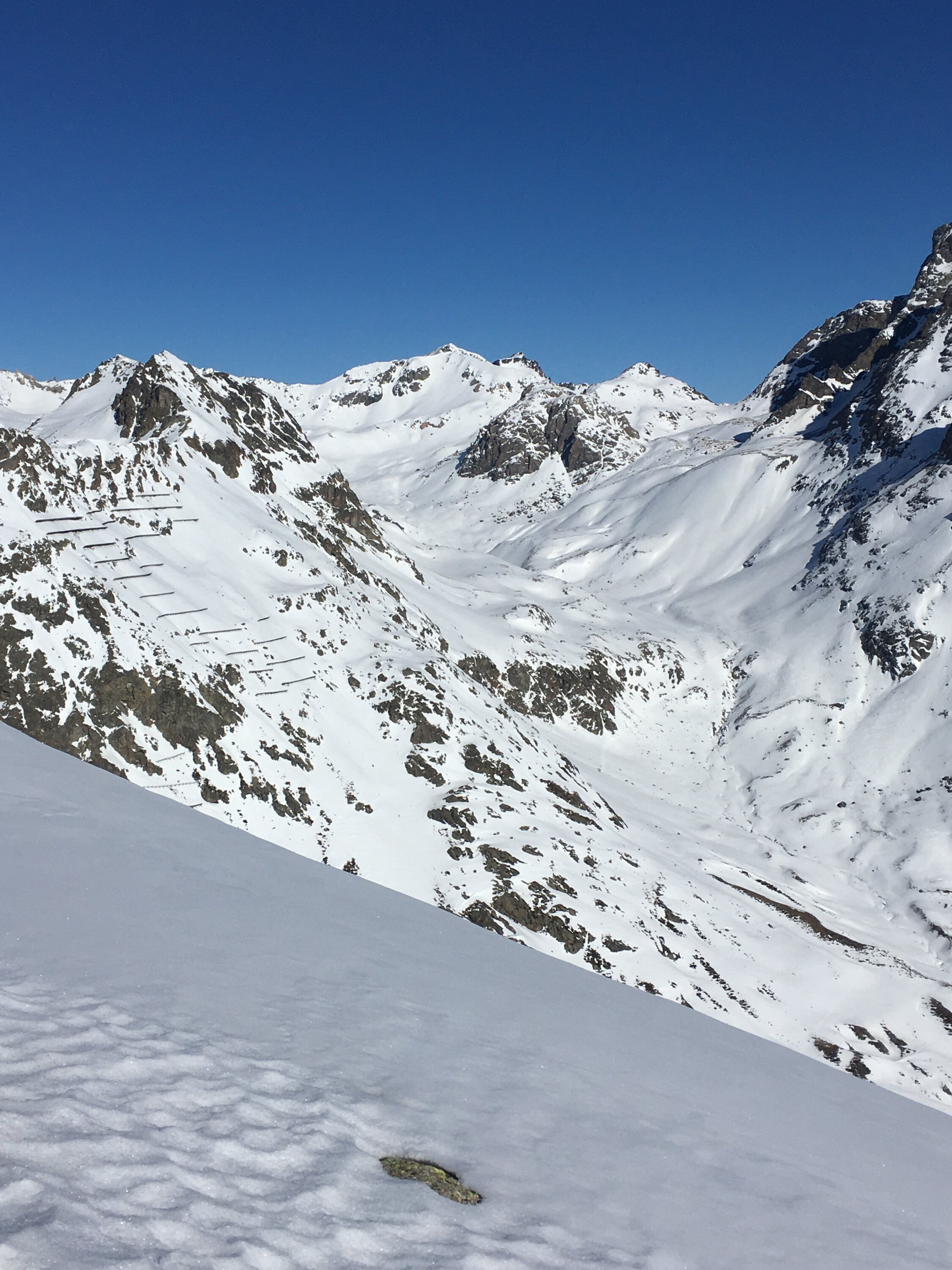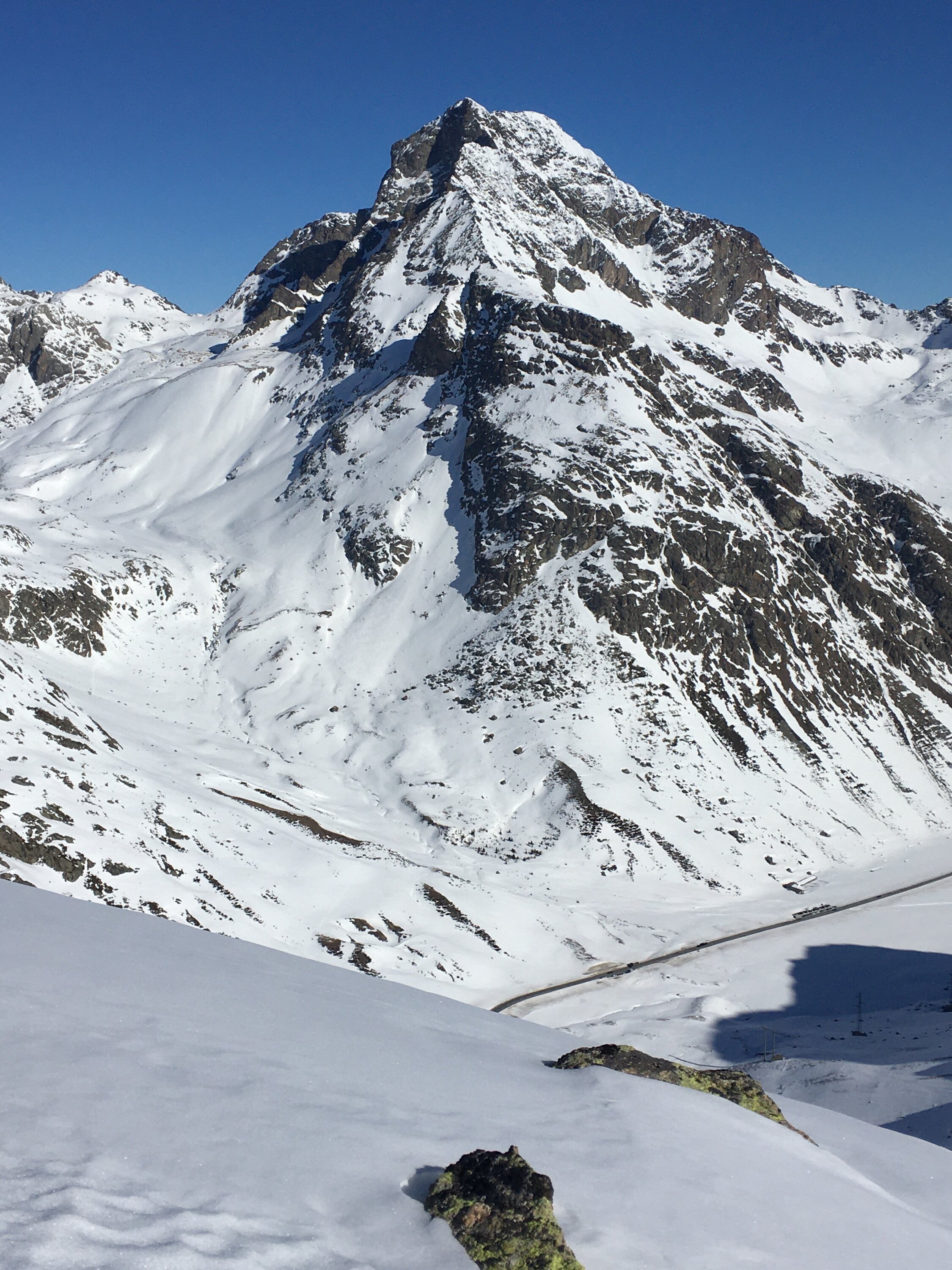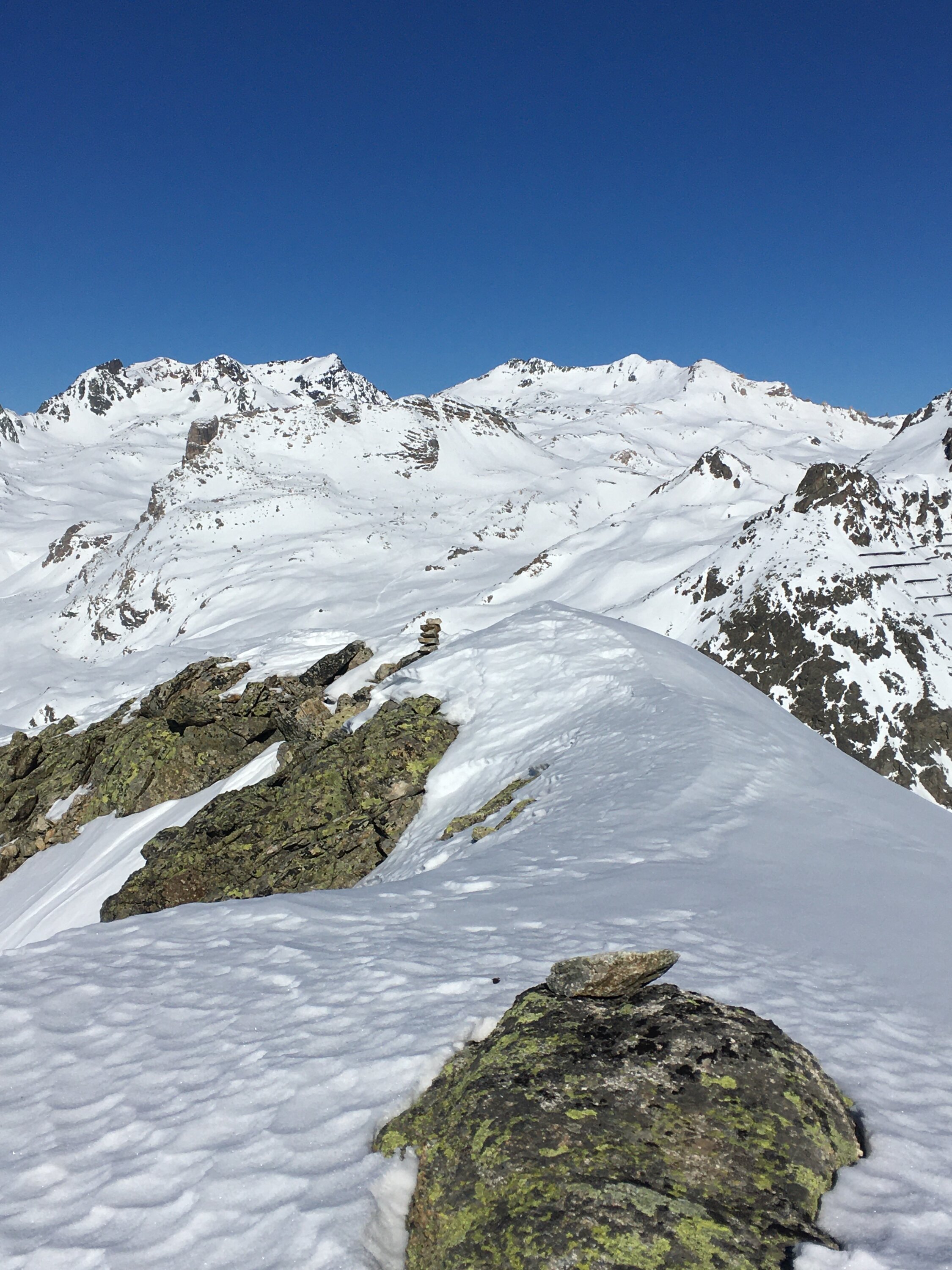 Erstaunlich, dass man auf den markanten Pfeiler mit Ski bis auf den Gipfel gehen kann. Lohnende Variante zum Gipfel Piz da las Coluonnas, Man ist garantiert alleine. Im Gegensatz zum Val d´Agnel. Auf dem Piz da las Coluonnas war eine grössere Gruppe italienischer Tourengänger.