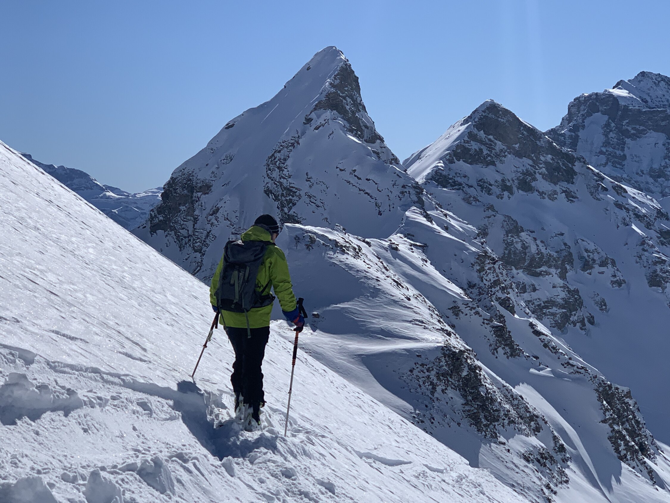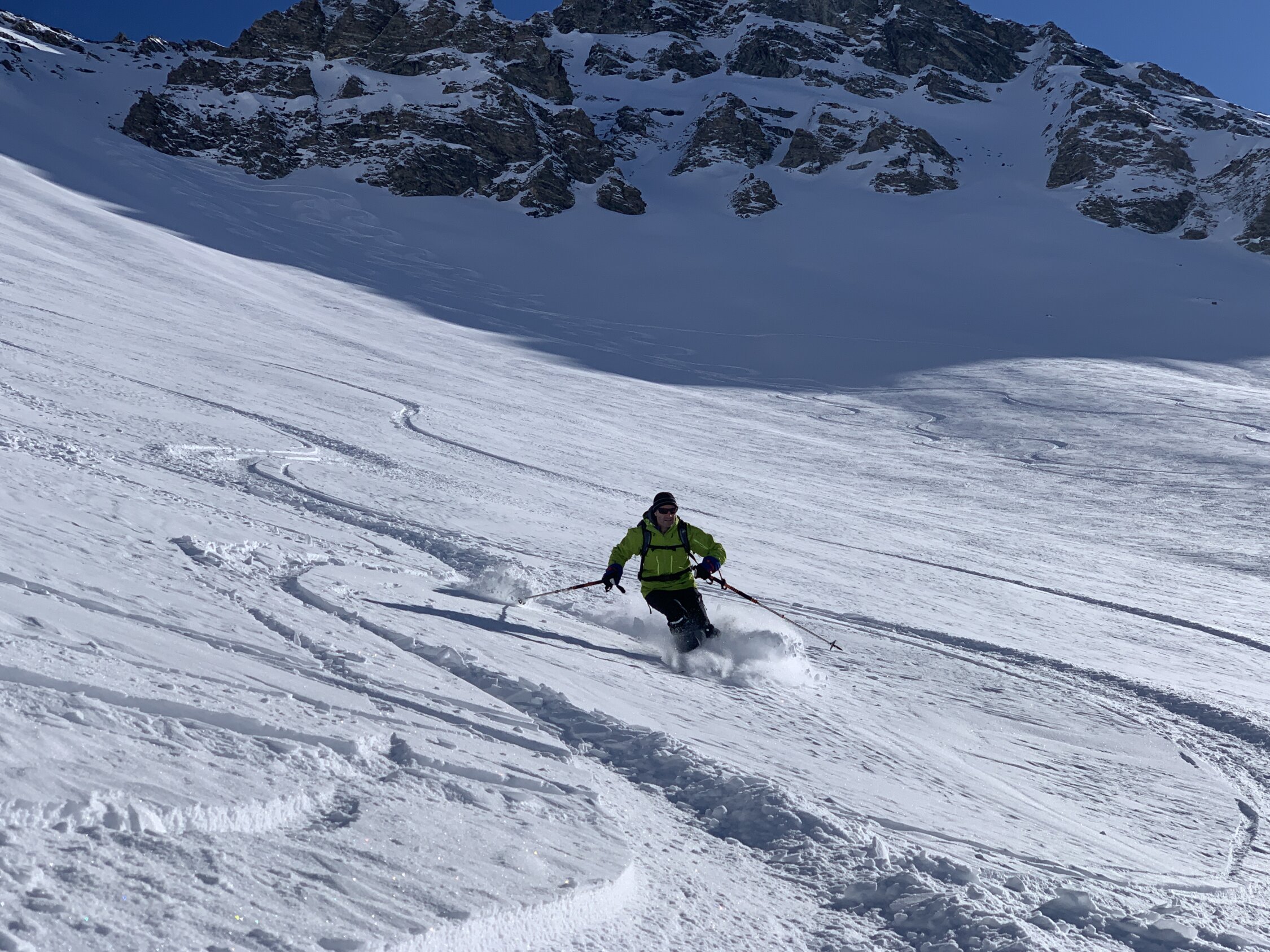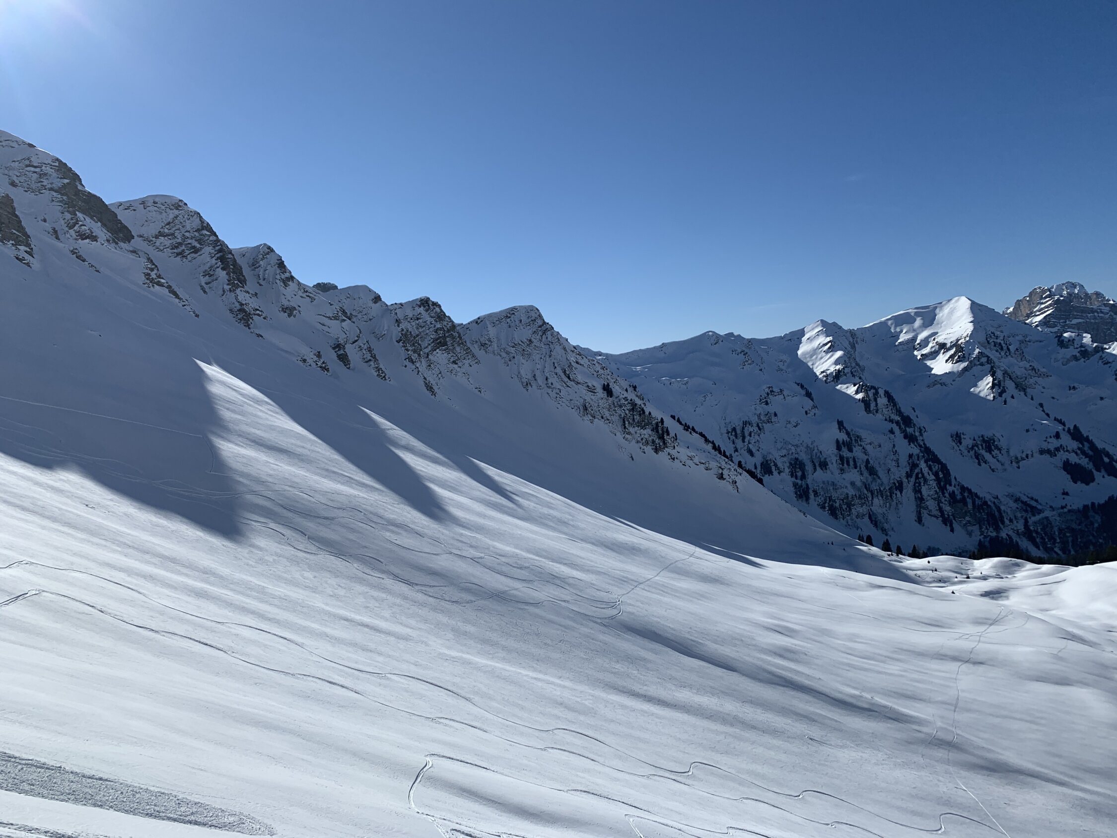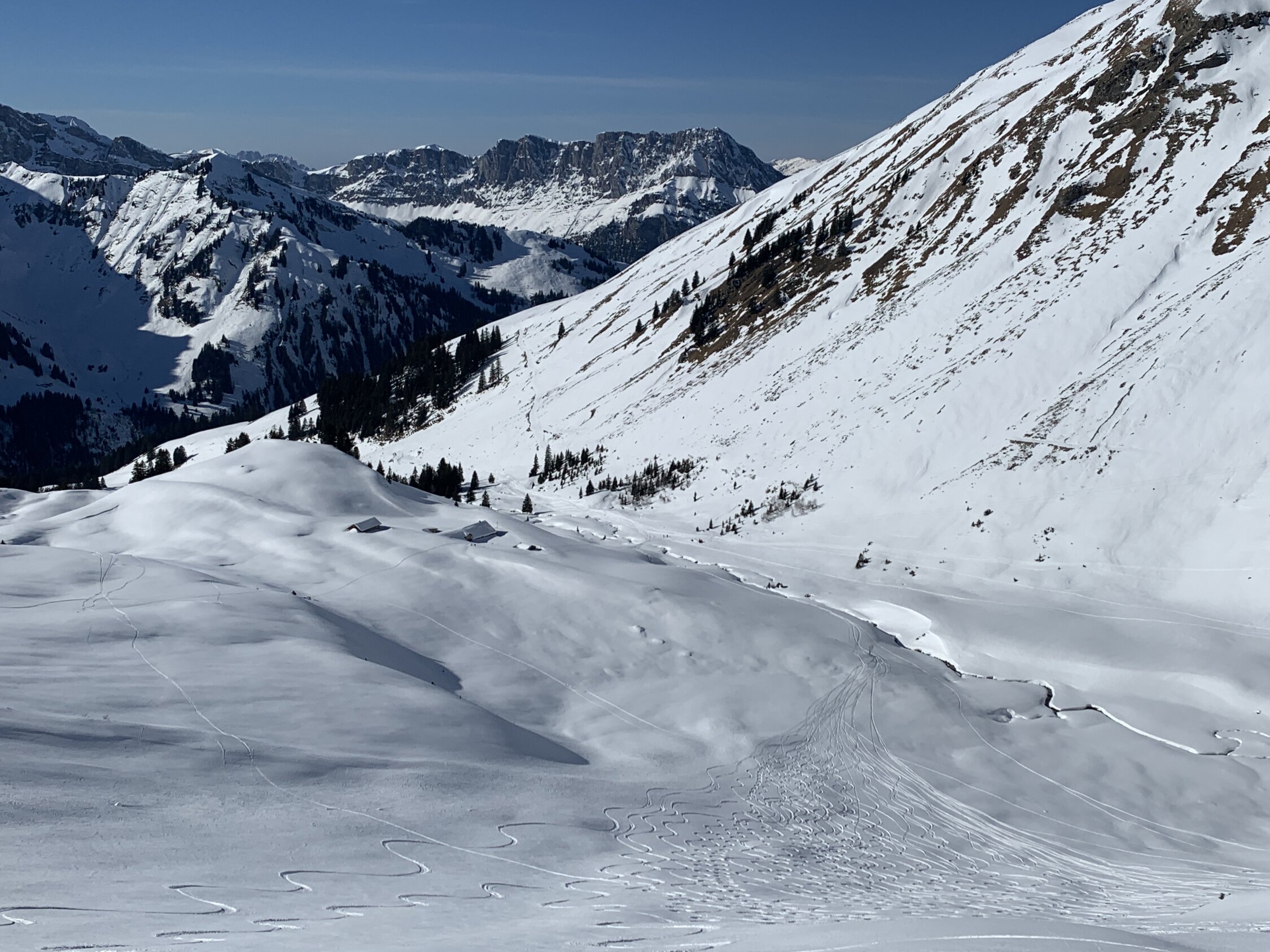 Abfahrt dann mit Traverse Richtung Erbithore. Dort dann feiner Pulver auf tragendem Harschdeckel. Der Wind hat hier jedoch schon auch ein bisschen gearbeitet.
