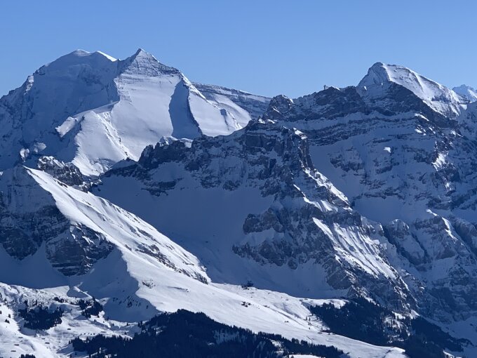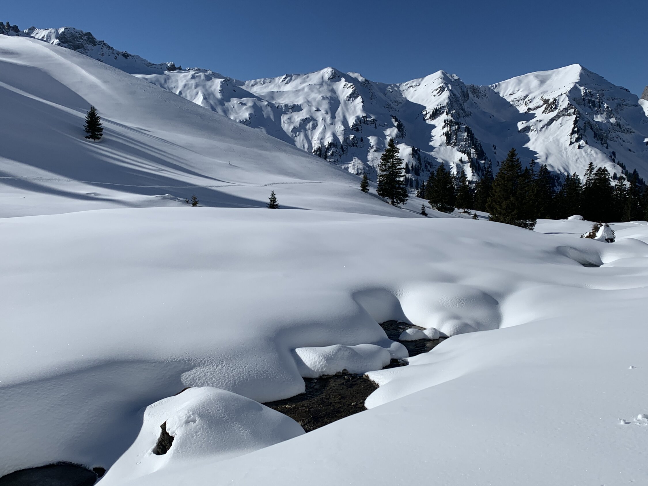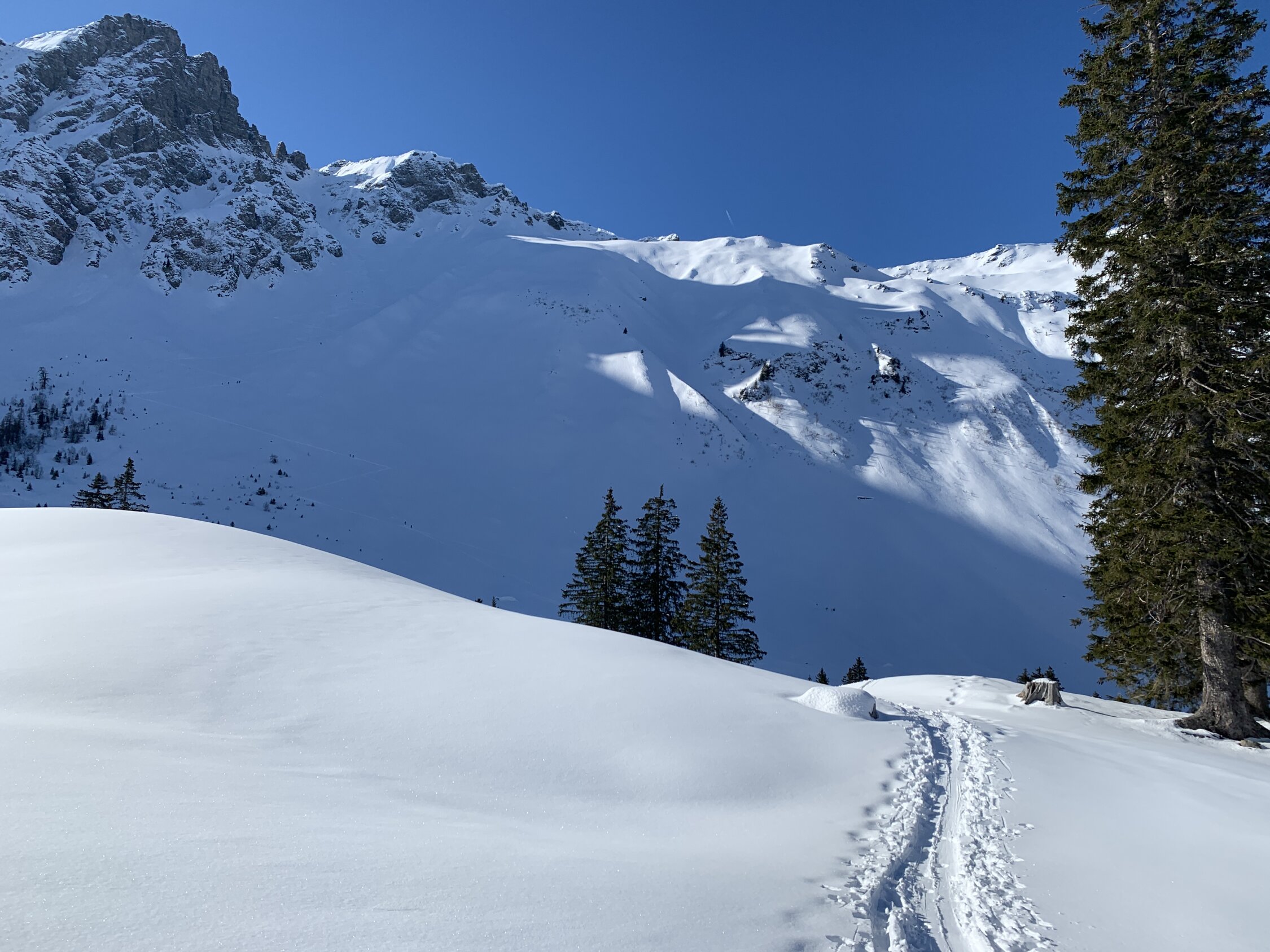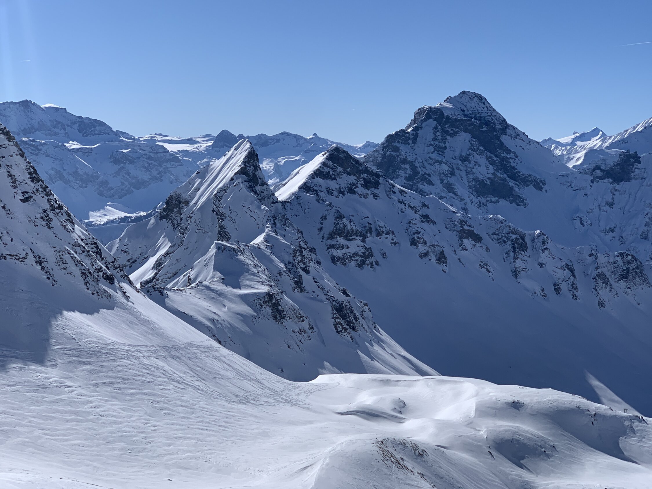 Abfahrt dann mit Traverse Richtung Erbithore. Dort dann feiner Pulver auf tragendem Harschdeckel. Der Wind hat hier jedoch schon auch ein bisschen gearbeitet.