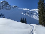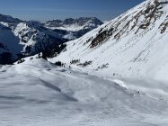 Der Gipfelhang ist schon recht zerackert und durch die Exposition etwas glatt im Aufstieg. Wir sind es heute ohne Harscheisen gegangen, was noch gut klappt - aber mit ist es sicherlich einfacher. Eine wirklich gute Spur gibt es oben aufgrund der vielen Abfahrer nicht mehr - bzw ist sie teilweise etwas zu steil angelegt.