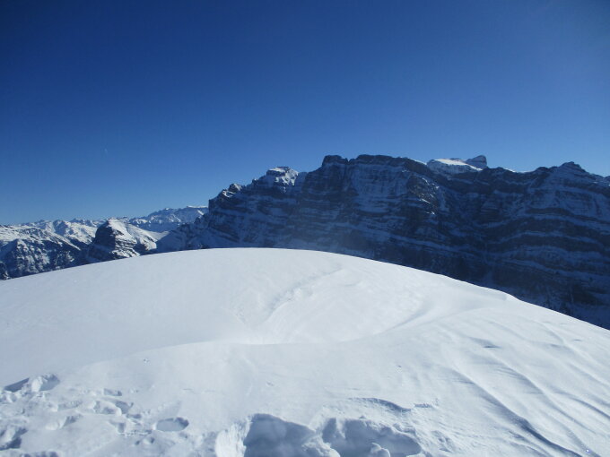 Top-Verhältnisse, sowohl vom Wetter, als auch vom Schnee her. Nur ging die Tour gleich mit einer Panne los: eine Niete der Bindung eines Schneeschuhs hatte sich verabschiedet. Wir starteten trotzdem, und in der harten Spur ließ es sich auch mit beschädigtem Schneeschuh ganz ordentlich aufsteigen. Beim Abstieg jedoch, nicht ganz unerwartet, verabschiedete sich dann die zweite Niete bereits nach dem dritten Schritt. Dank tragender Altschneedecke kam ich aber auch nur mit einem Schneeschuh am einen, und nur der Bindung am anderen Fuß recht gut wieder herunter. Dennoch ein wenig schade, denn Schneesituation, kombiniert mit oft idealer Hangneigung hätten ein genussvolles Hinabstieben erlaubt. Obwohl die Hänge zerfahren waren, konnte sich auch Stefan auf Skiern an einer wunderschönen Pulverabfahrt erfreuen.